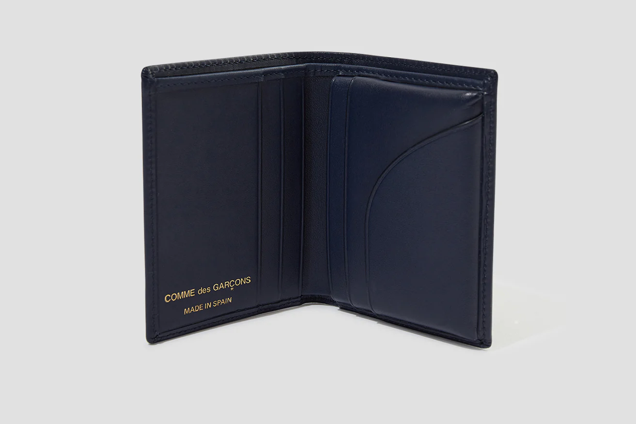 COMME des GARCONS Classic Leather Card Holder delivers minimalist functionality with premium craftsmanship. Made from smooth navy leather with contrast stitching, featuring the brand's signature clean aesthetic and compact design. The structured construction and refined hand-feel provide timeless elegance for everyday carry.