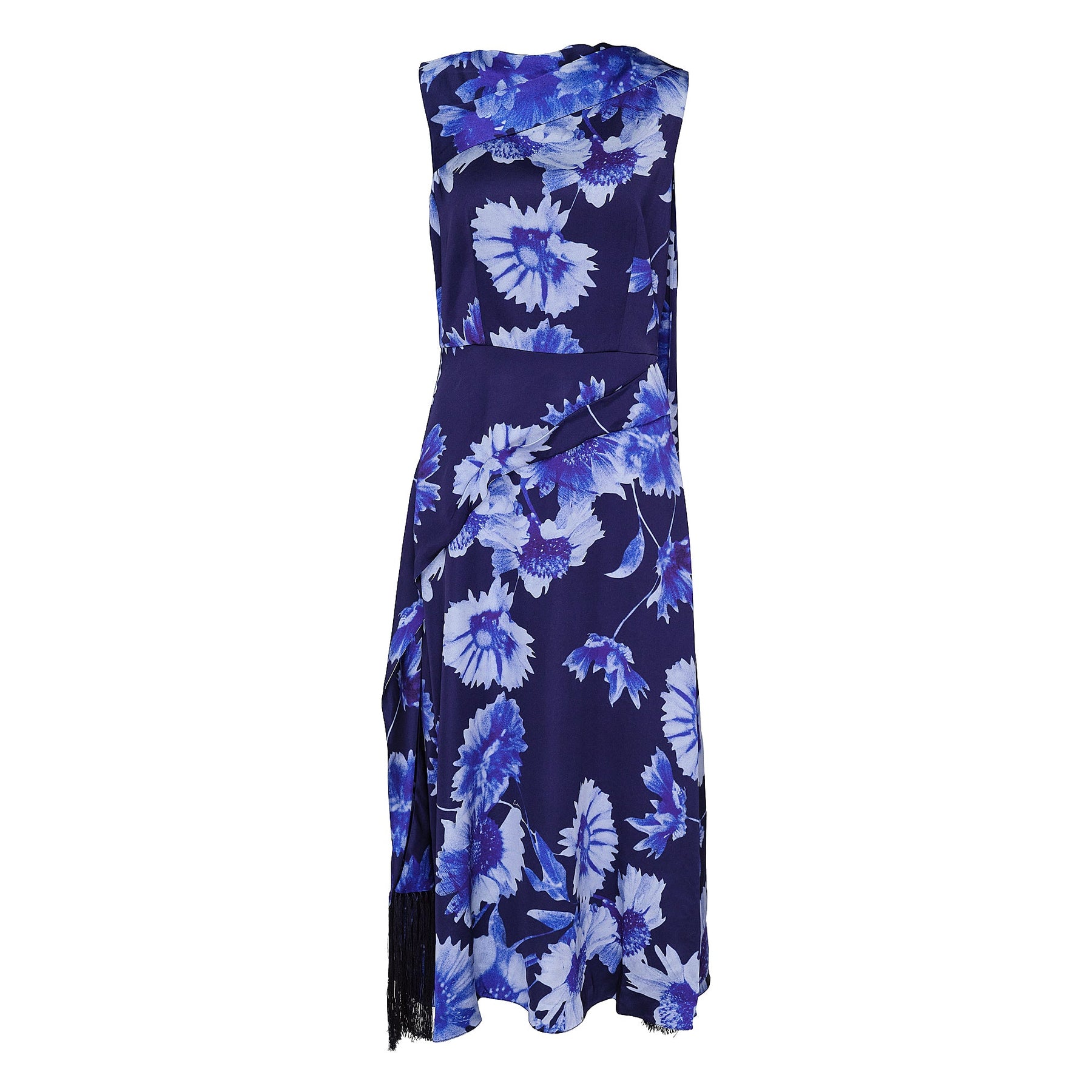 This indigo satin dress is draped at the neckline and hip to craft an asymmetric silhouette. It is decorated with large flowers and finished with tasselled trims.