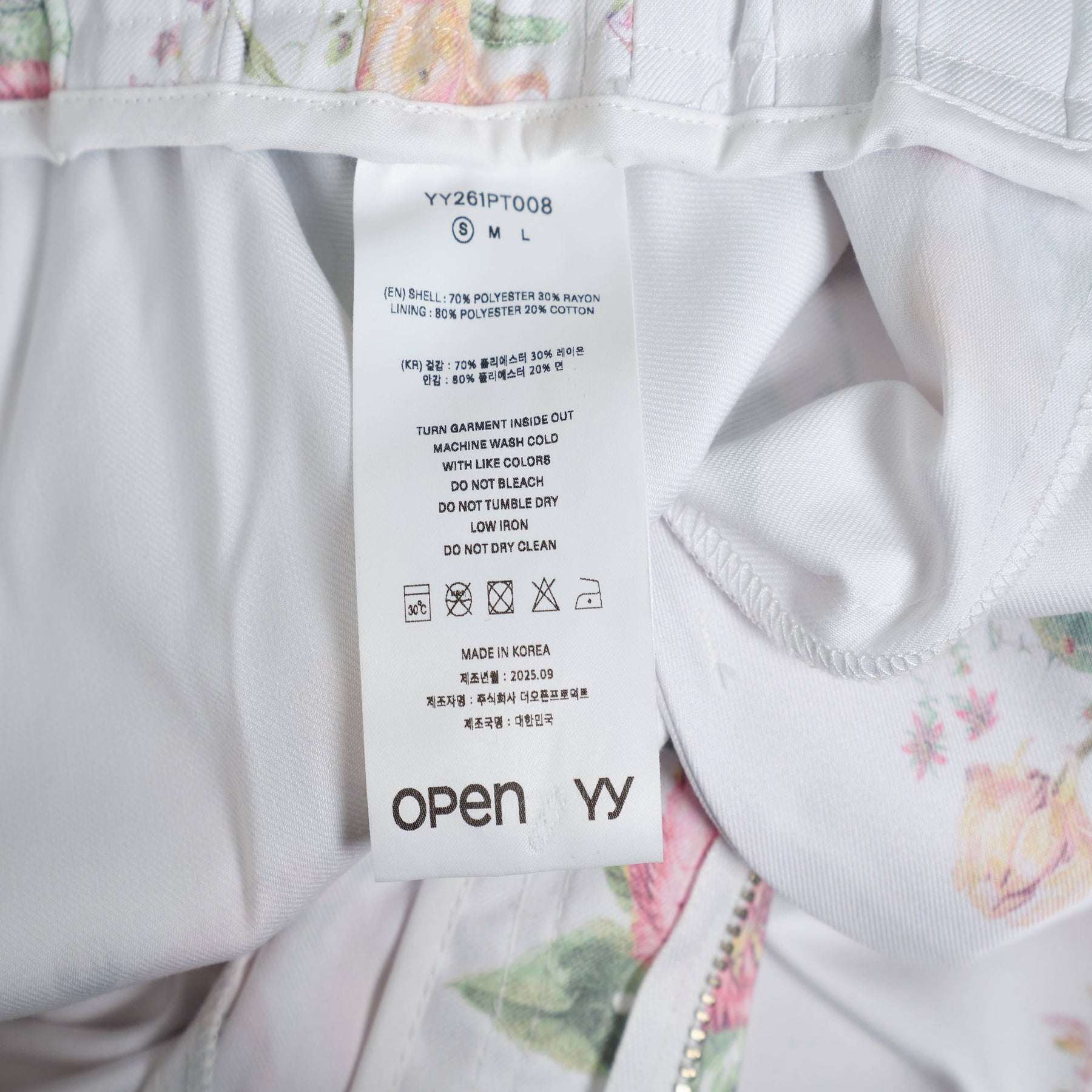 OPEN YY Floral Full Gather Pants deliver feminine elegance with contemporary silhouette and romantic botanical prints. Crafted from lightweight flowing fabric in soft white base with delicate pink and peach florals, featuring full gathering for graceful movement. The relaxed wide-leg construction and elastic waistband create effortless comfort for versatile styling.