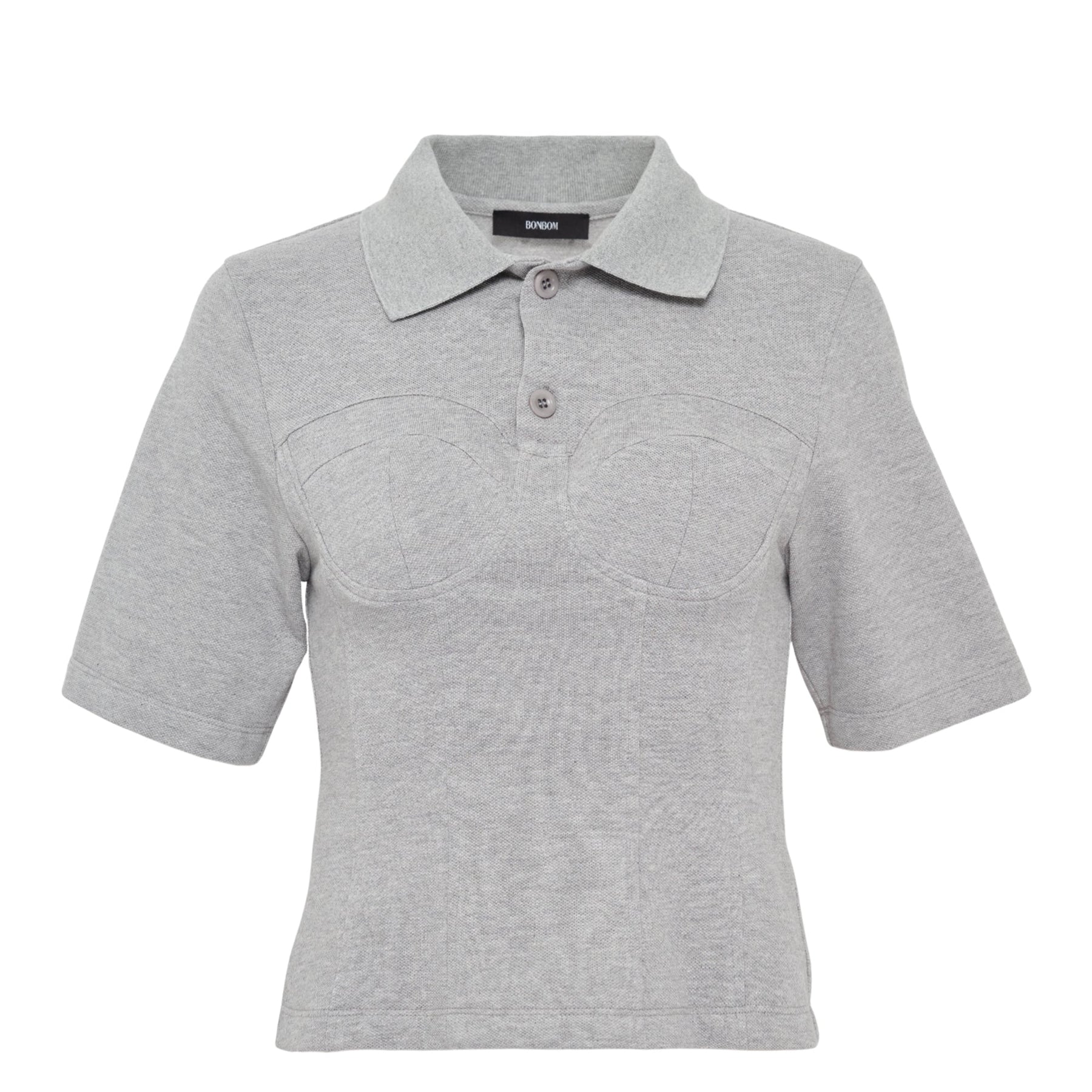BONBOM Half Sleeve Corset Pique T-Shirt delivers structured feminine silhouettes with contemporary athletic-inspired design. Crafted from premium pique cotton in sophisticated heather gray, featuring built-in corset detailing and polo collar construction. The sculptural bustier seaming and sport-luxe aesthetic create a modern statement piece that bridges athletic and elegant styling.