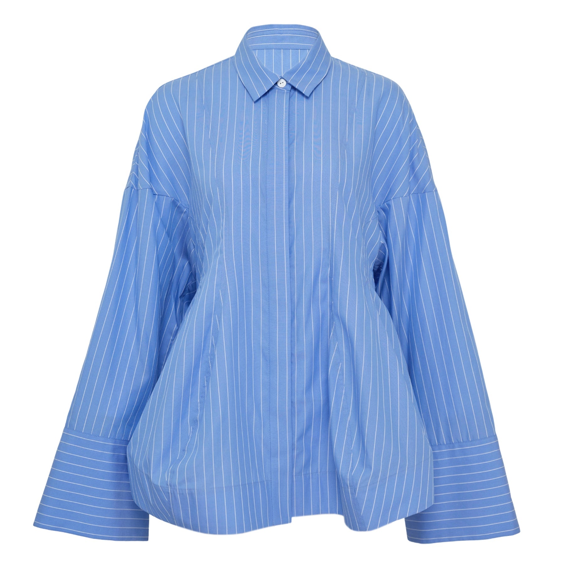 The ENFOLD Stripe Curved Hem Overshirt delivers contemporary sophistication with architectural silhouette and refined details. Crafted from crisp cotton in classic blue and white pinstripes, featuring dramatic bell sleeves and curved hemline construction. The oversized fit and signature minimalist aesthetic create an effortlessly chic statement piece for modern wardrobes.