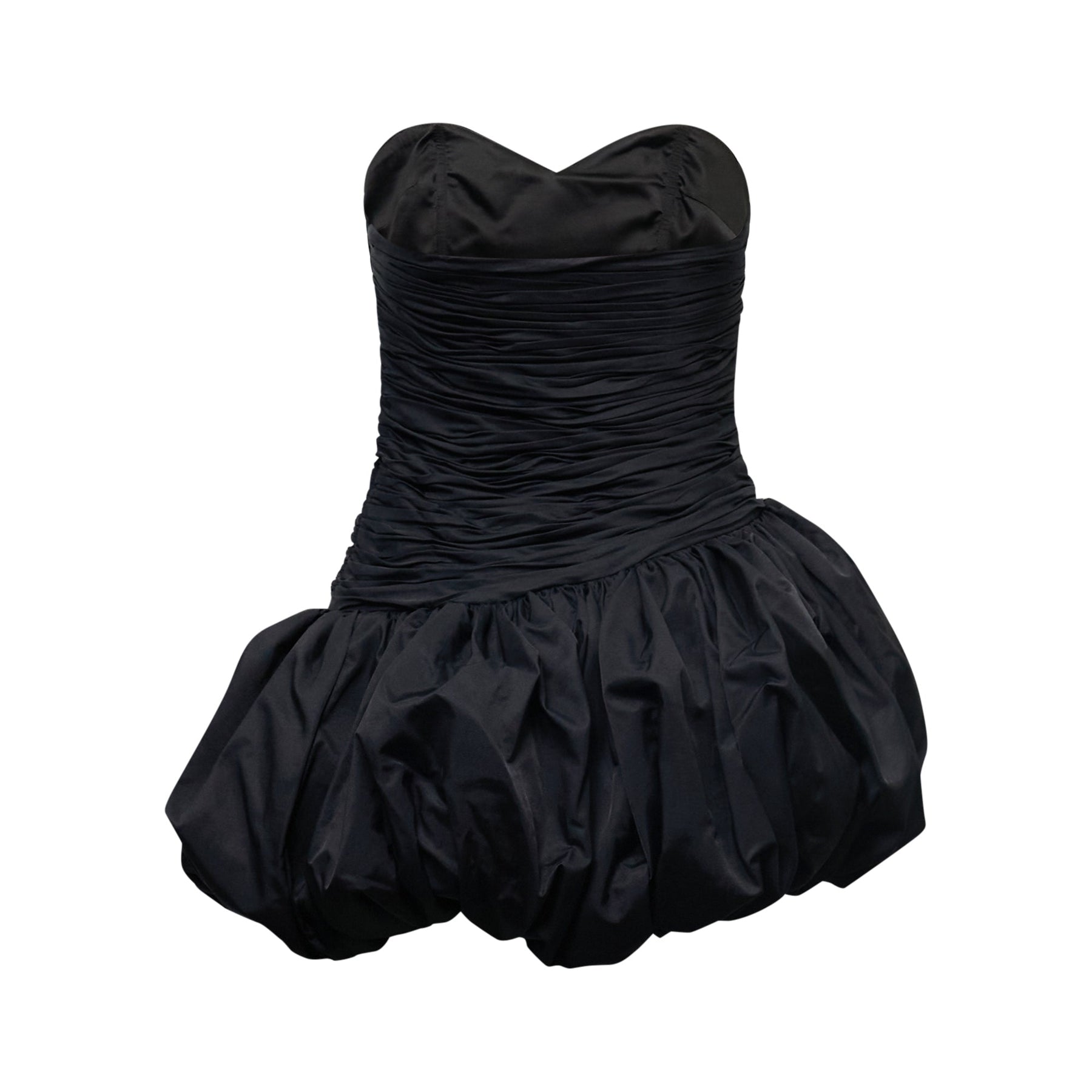 The Stolen Stores Balloon Draped Mini Dress delivers contemporary glamour with sculptural silhouette and dramatic volume. Crafted from luxurious black taffeta fabric with intricate pleating through the bodice and signature balloon hemline construction. The strapless sweetheart neckline and gathered bubble skirt create a striking statement piece for special occasions.