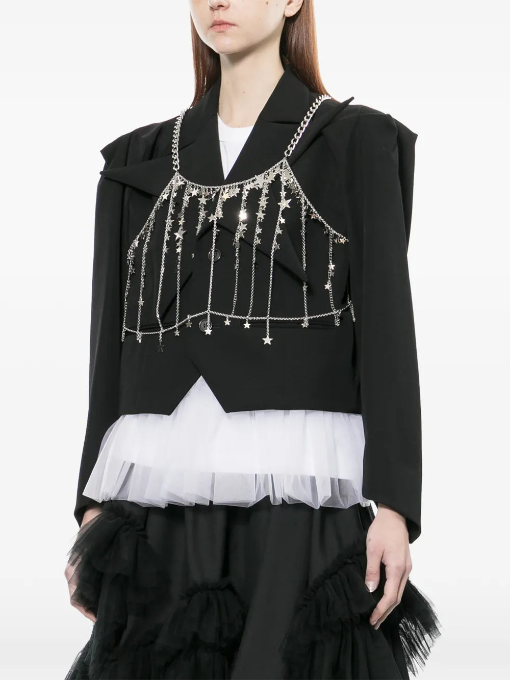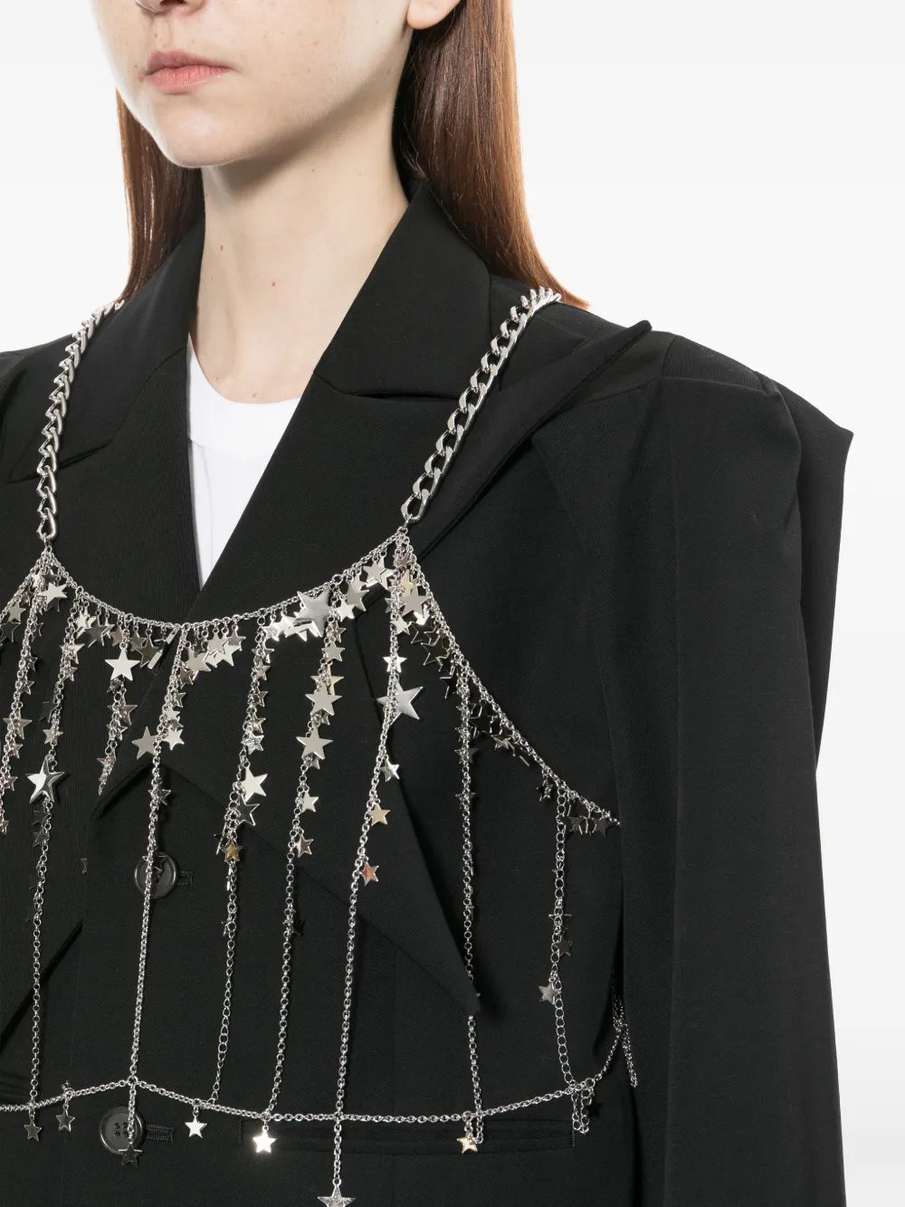 Noir Kei Ninomiya Charm x Chain delivers avant-garde body jewelry with architectural metal construction and dramatic silhouette enhancement. Crafted from polished silver-tone chain mail with cascading star charms, featuring multiple layered strands and adjustable chain connections. The sculptural design transforms the body into a canvas for contemporary wearable art with signature Comme des Garçons innovation.