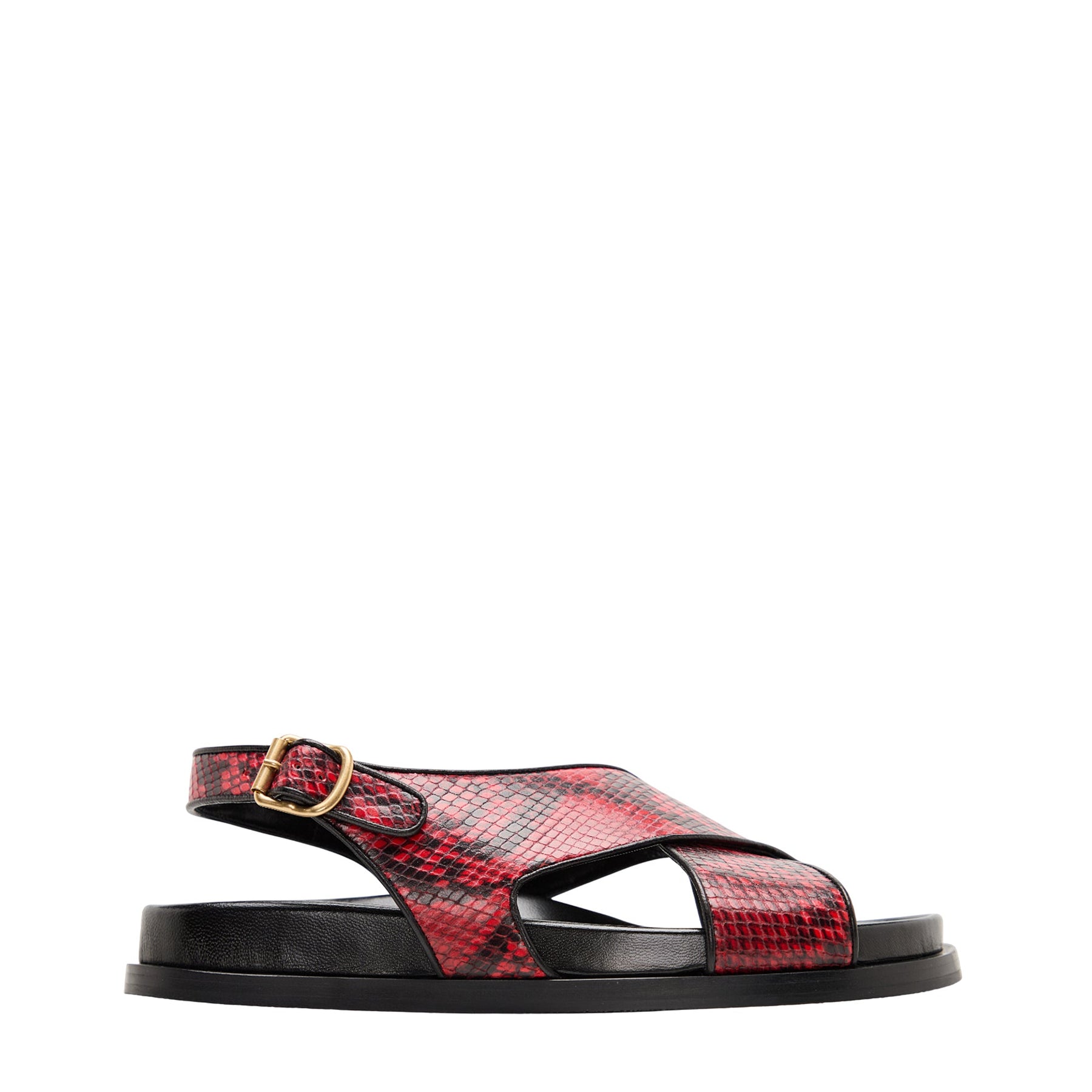 Leather fussbett sandals with criss-crossing straps and snakeskin print.