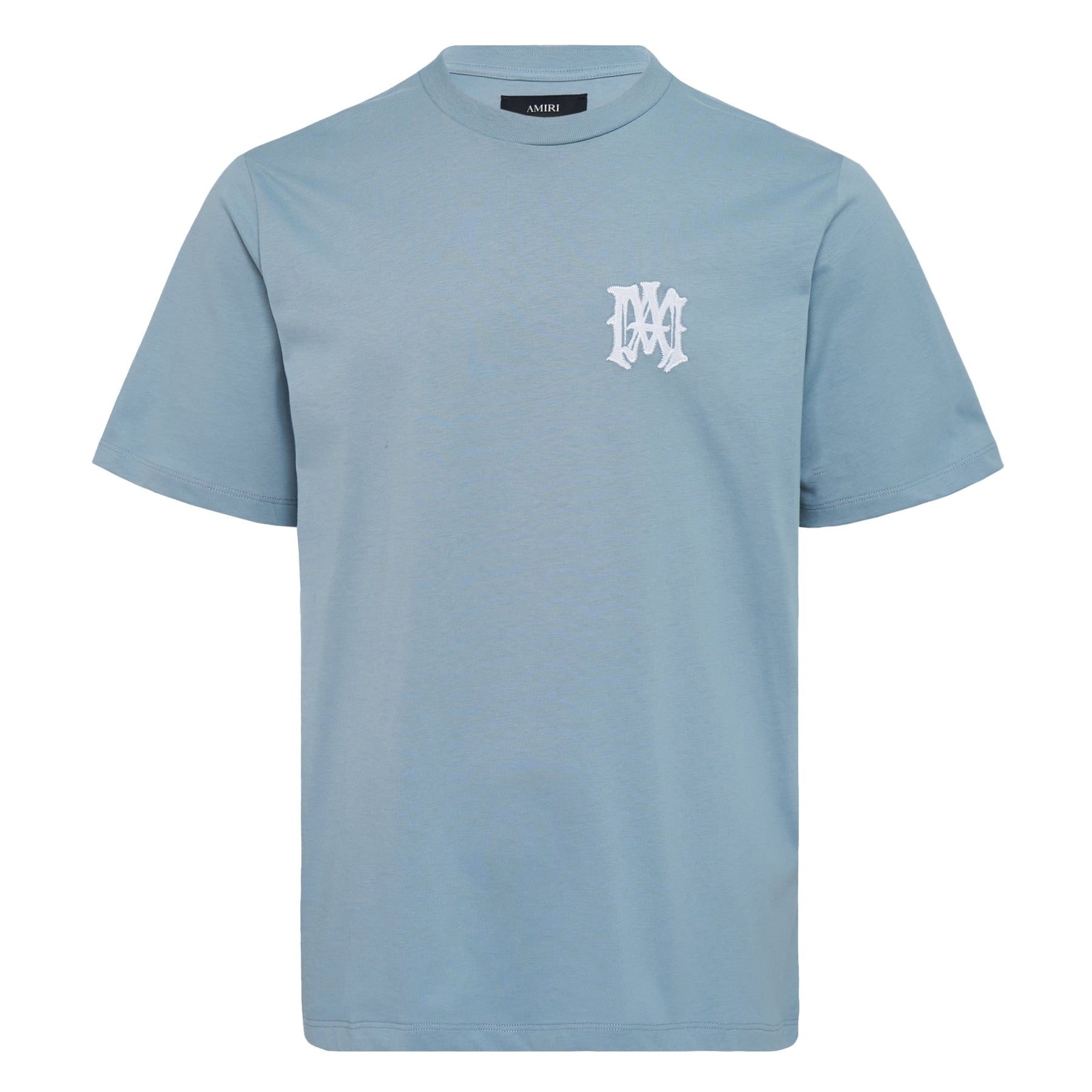 AMIRI Ma Chateau Tee delivers luxury streetwear with premium cotton construction and signature brand detailing. Crafted from soft cotton jersey in sophisticated light blue, featuring embroidered monogram branding on the chest. The relaxed fit and elevated design aesthetic create a versatile statement piece for contemporary wardrobes.