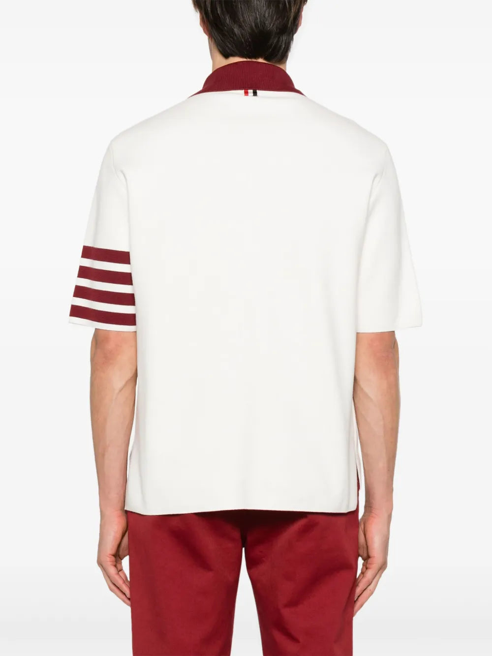 Thom Browne Milano Stitch 4-Bar Rugby Fit Polo delivers preppy sophistication with signature athletic-inspired construction. Crafted from premium milano stitch cotton with contrasting burgundy collar and iconic 4-bar striping on the right sleeve. The rugby fit silhouette and contrast details embody the brand's heritage American sportswear aesthetic.