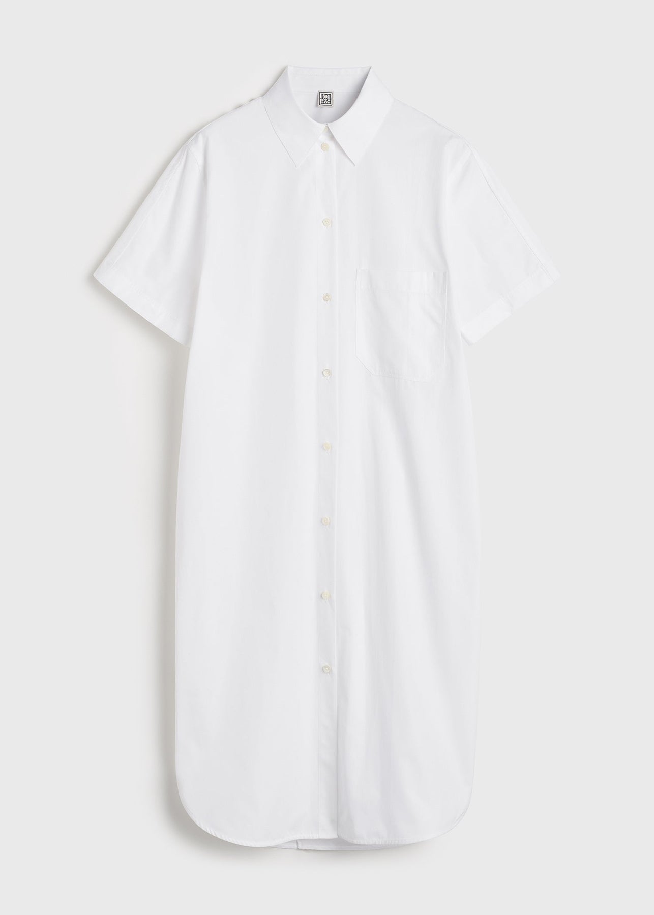TOTEME Short-Sleeve Shirtdress delivers minimalist sophistication with versatile styling for modern wardrobes. Crafted from crisp cotton poplin in clean white, featuring classic shirt construction with contemporary proportions. The relaxed silhouette and signature Swedish design aesthetic create an effortless piece for everyday luxury.