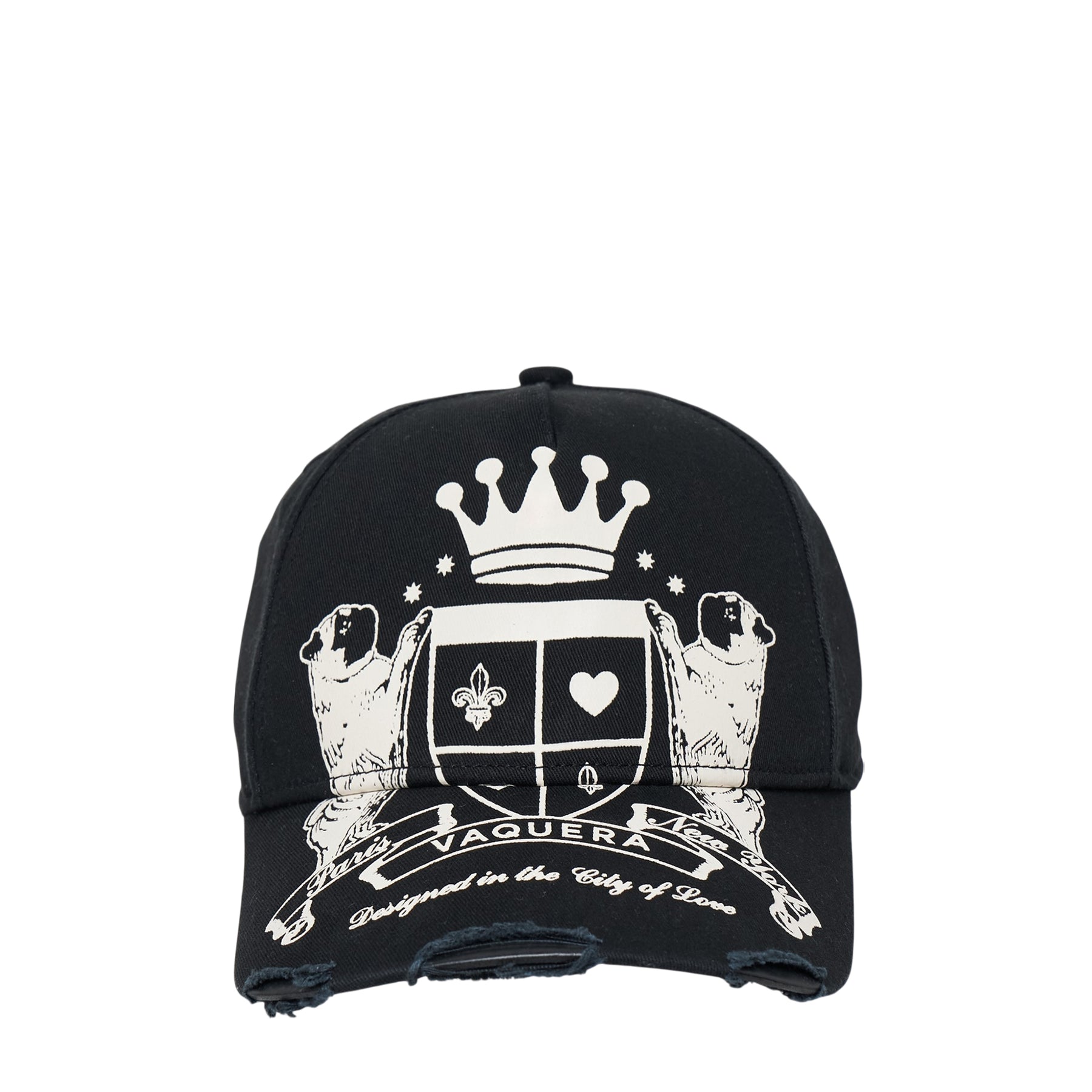 VAQUERA Women Crown Baseball Hat delivers avant-garde streetwear with royal-inspired graphic detailing and distressed finishing. Crafted from premium woven cotton in classic black, featuring white crown crest embroidery and deliberately frayed brim construction. The signature VAQUERA aesthetic combines high fashion with street-ready attitude for contemporary urban styling.