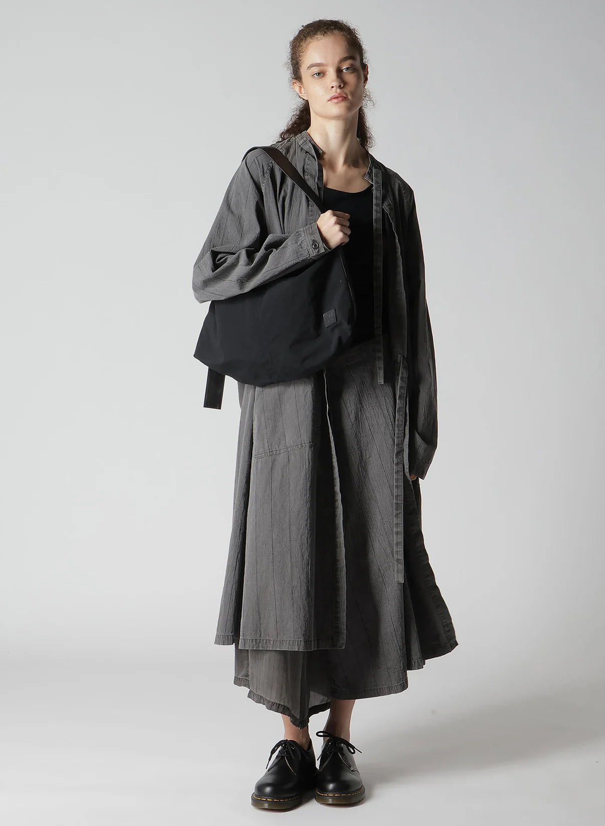 This light nylon shoulder bag features a washer-finish and leather accents, making it suitable for various occasions without being too casual. It has an asymmetrical design that comfortably fits the body. Note that due to the nature of leather, there might be slight color fading from sweat and friction.
