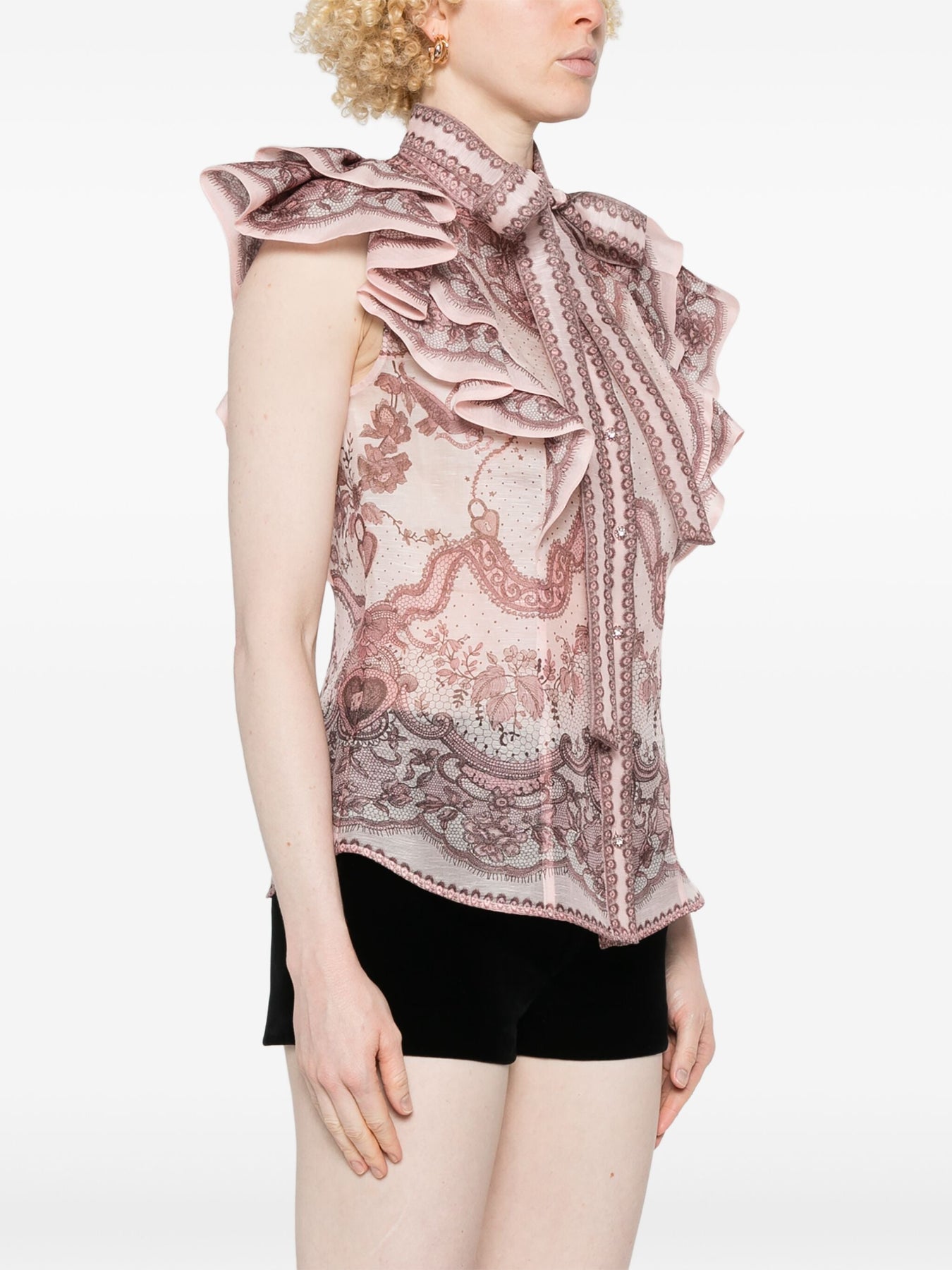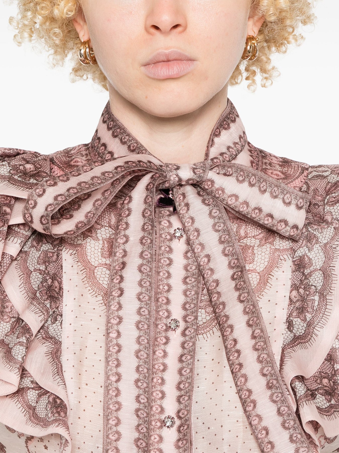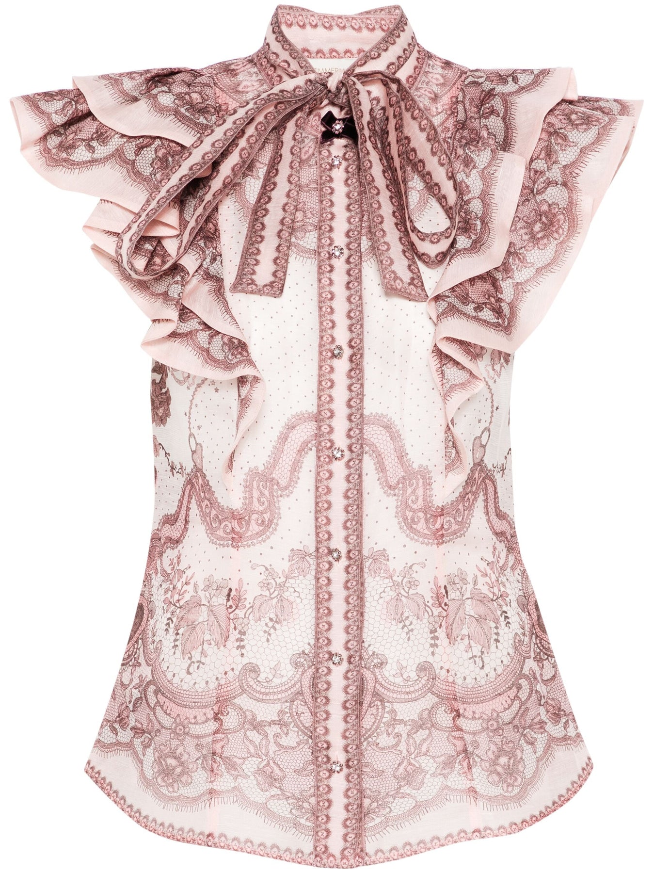 The Crush Frilled Fitted Blouse in Pink Lace Print from our Resort 2025 Collection, Crush. A silk linen organza blouse featuring short sleeves with double layered frills, a stand collar with a neck tie featuring velvet bow detailing; finished with crystal buttons down the centre front.
