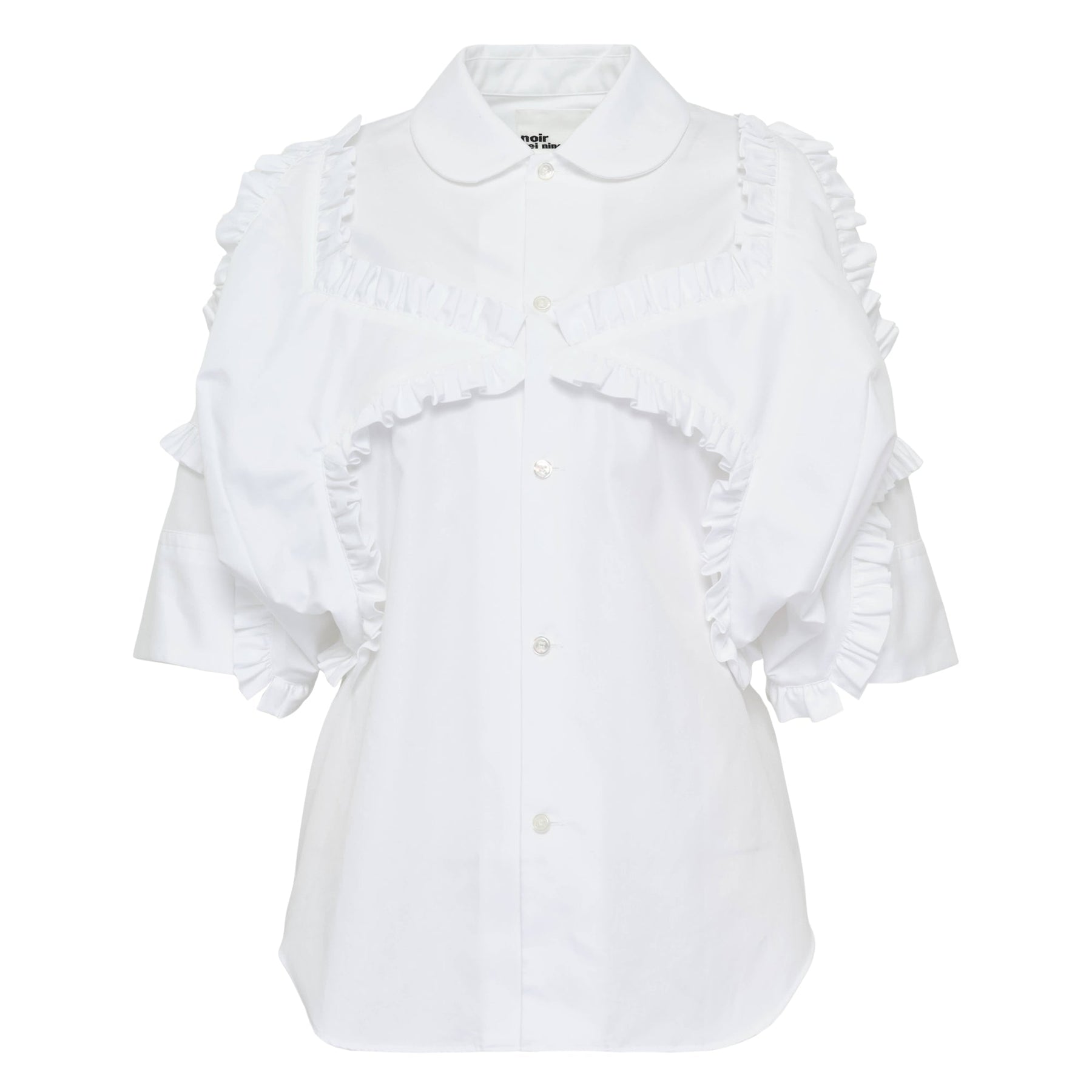 Noir Kei Ninomiya Cotton Broad Shirt delivers avant-garde femininity with architectural ruffled construction and contemporary silhouette. Crafted from crisp cotton broadcloth in pure white, featuring dramatic cascading ruffle details across the bodice and shoulders. The structured collar and tailored fit create a sophisticated statement piece that embodies the brand's innovative approach to feminine design.