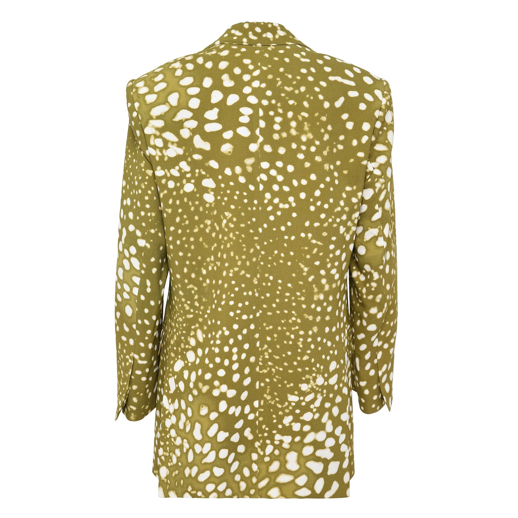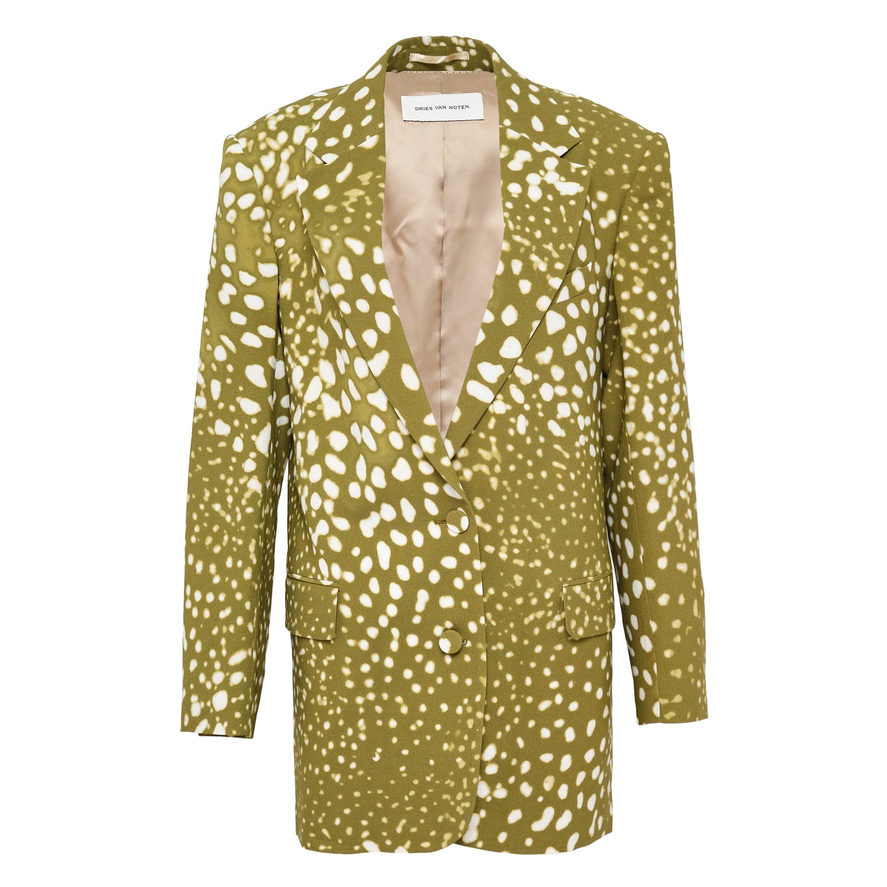 The Dries Van Noten Oversized Unconstructed Double Blazer delivers contemporary tailoring with relaxed sophistication and artistic flair. Crafted from premium fabric with a distinctive spotted print in olive green and cream, featuring an unconstructed silhouette for effortless comfort. The double-breasted design and oversized proportions create a modern statement piece that embodies the brand's signature avant-garde aesthetic.