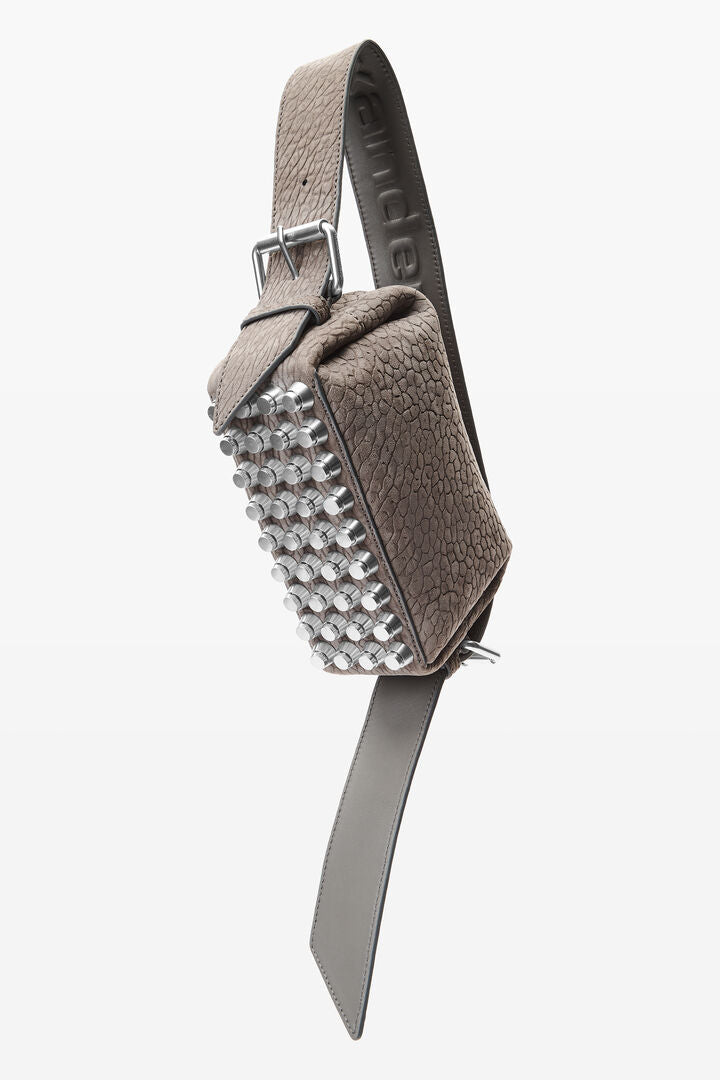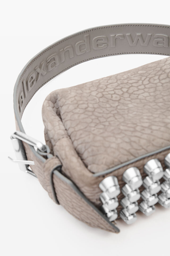 小さなグレーのリッコバッグは、トップジップクロージャーで留まり、ロゴエンボス加工されたショルダーおよびクロスボディストラップが2本付属しています。"プライマル"ラムスキンレザーが軽量の(台形)"トラップ"スタッズを引き立てます。