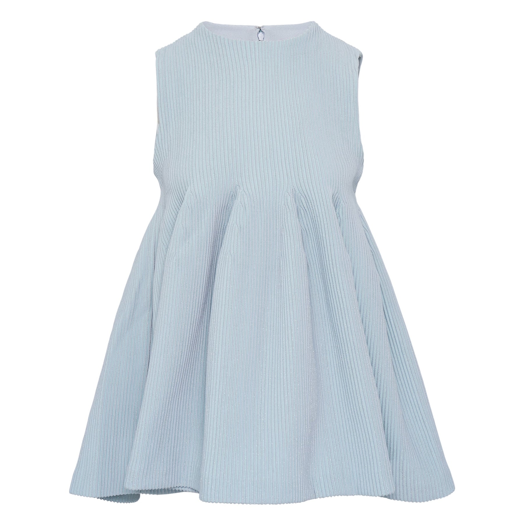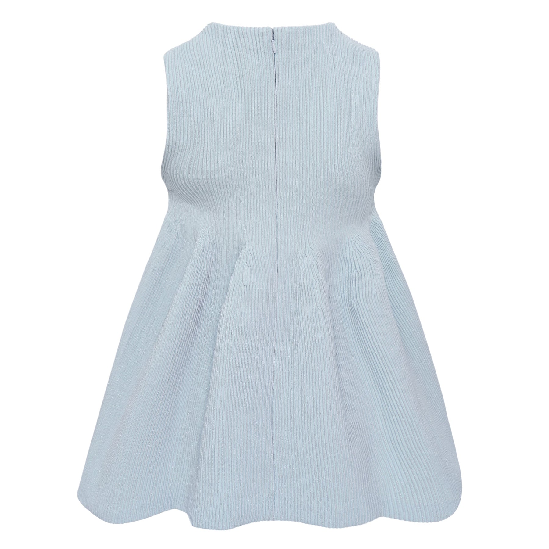CFCL Hypha Glitter Bust Flare Sleeve Top delivers contemporary femininity with innovative Japanese craftsmanship and architectural silhouette. Crafted from premium ribbed knit fabric in soft powder blue, featuring a fitted bodice that flows into a structured flare skirt. The sleeveless design and subtle textural details create an elegant piece that bridges minimalist sophistication with modern femininity.