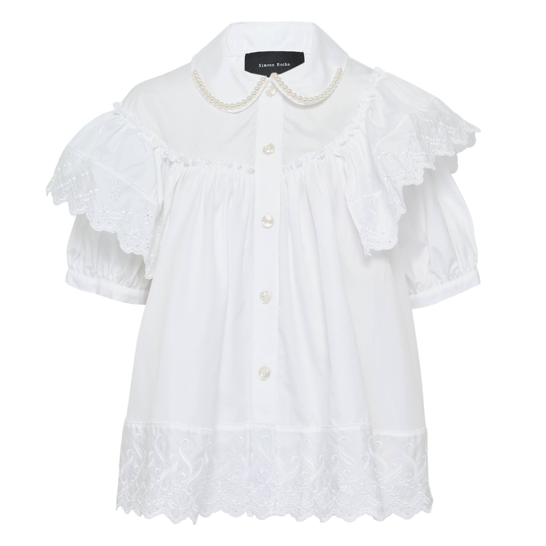The Simone Rocha Cropped Puff Sleeve Ruffle Blouse delivers romantic femininity with signature architectural construction and dramatic proportions. Crafted from crisp white cotton with intricate eyelet embroidery and tiered ruffles throughout, featuring pearl-detailed collar trim and voluminous sleeves. The brand's distinctive blend of Victorian romanticism and contemporary silhouette creates an elevated statement piece for modern wardrobes.
