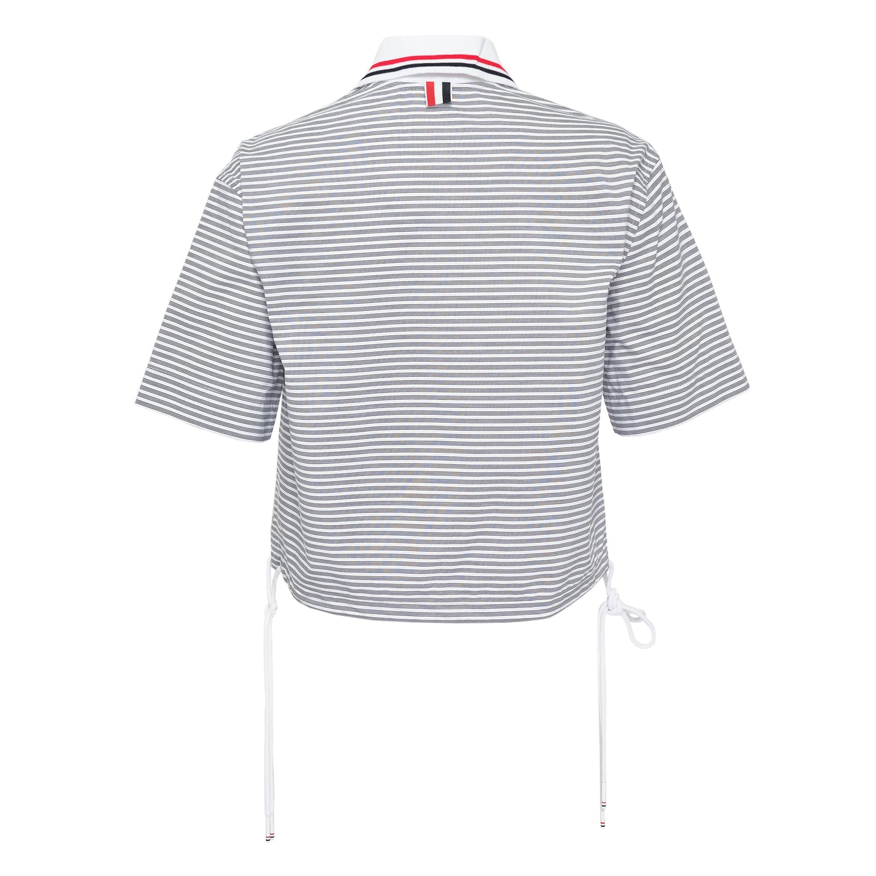 Thom Browne Drawstring Hem Polo Top delivers sophisticated sportswear with signature preppy tailoring. Crafted from premium cotton piqué with fine gray and white stripes, featuring the brand's iconic tricolor collar trim. The adjustable drawstring hemline and structured fit create a modern take on classic polo styling.