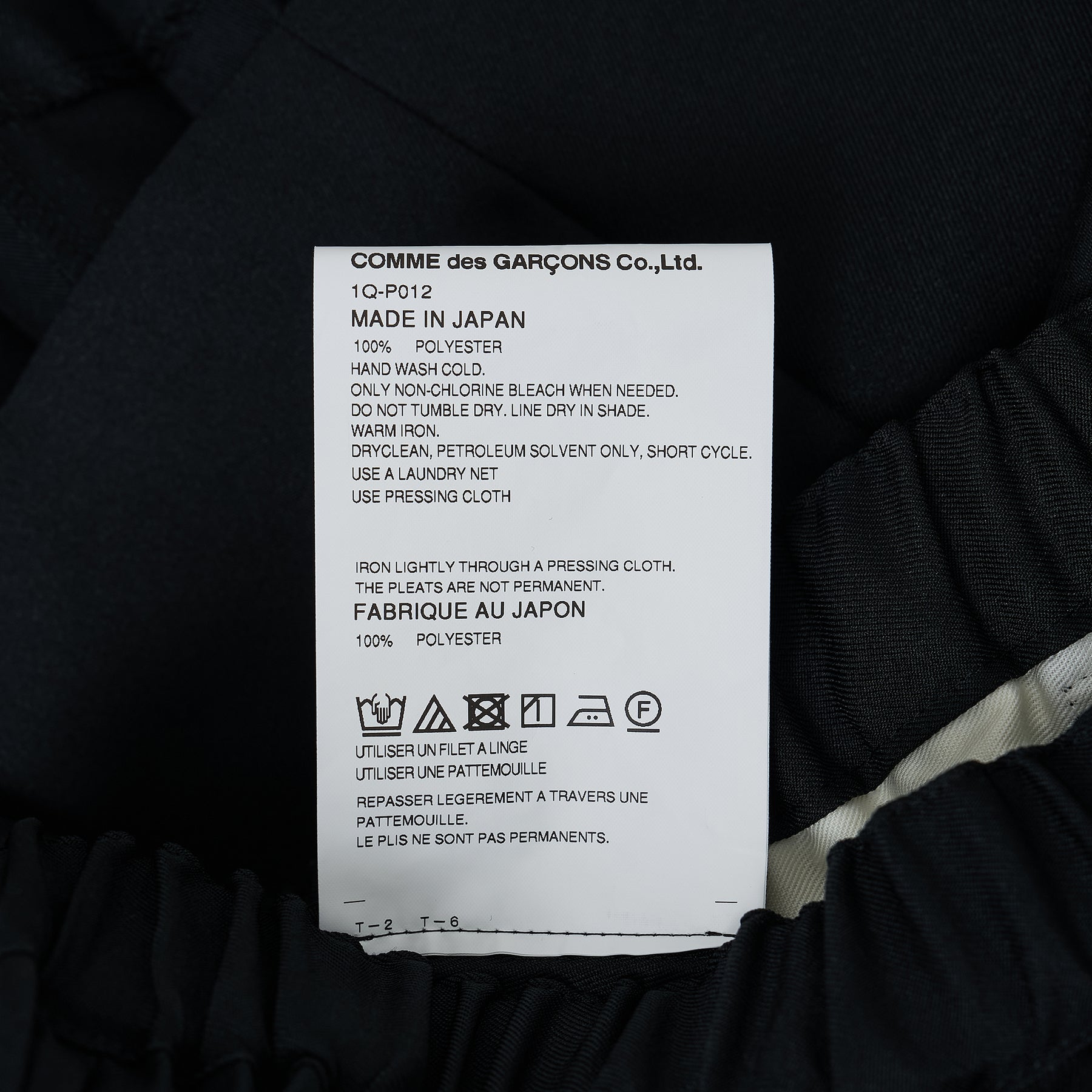 COMME des GARCONS BLACK pleated side panel pants deliver avant-garde tailoring with architectural design elements. Crafted from premium wool blend in deep black, featuring distinctive knife pleats cascading down each side panel for dramatic movement and visual texture. The innovative construction merges traditional pleating techniques with contemporary minimalist aesthetic.