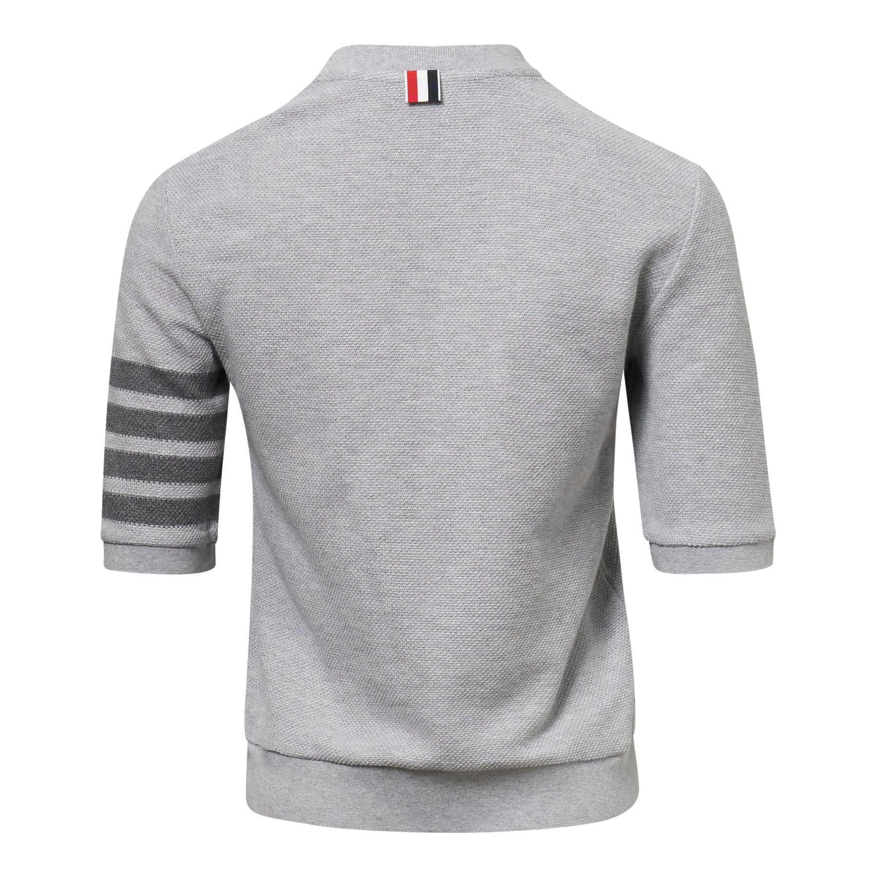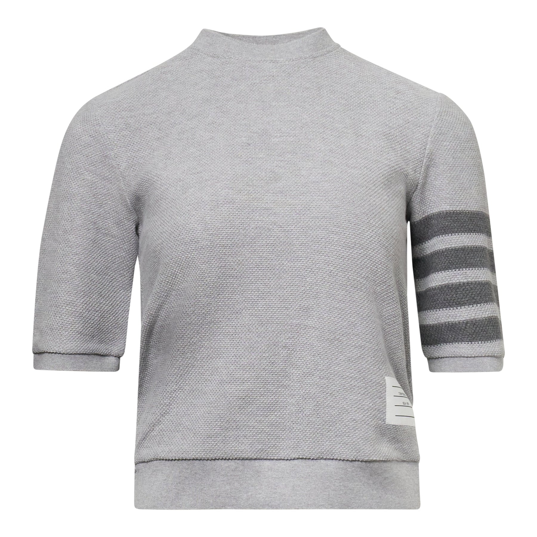 Thom Browne Rib Cuff Tee delivers preppy sophistication with signature architectural construction and premium textured fabrication. Crafted from luxury cotton pique in refined light grey, featuring ribbed collar and cuffs with distinctive striped sleeve detailing. The structured silhouette and iconic four-bar stripe branding create a polished statement piece for contemporary wardrobes.