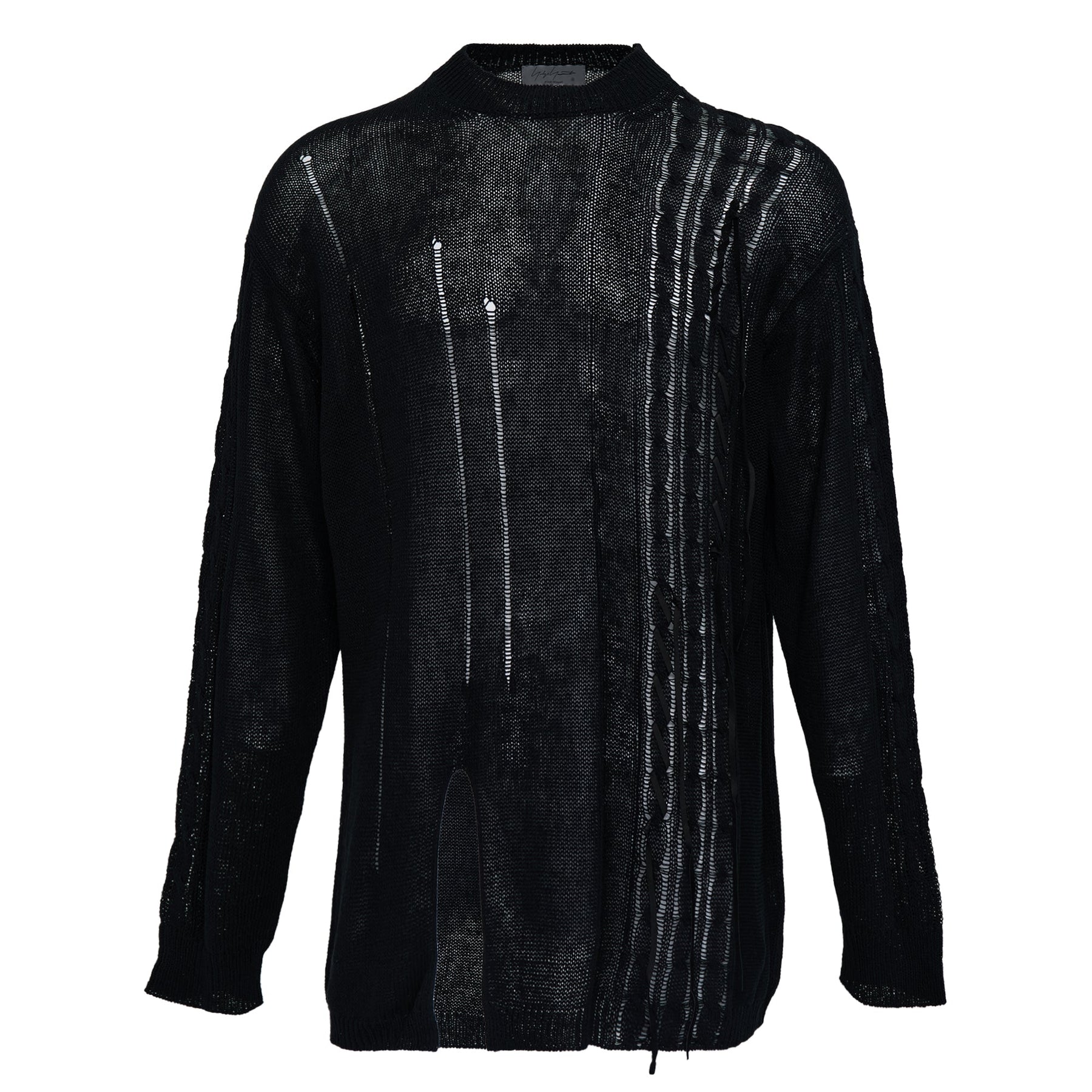 Yohji Yamamoto Round Neck Leather Pullover delivers avant-garde luxury with architectural knitwear construction. Crafted from premium black leather knit with mesh-like perforations throughout, featuring dramatic vertical zip detailing and deconstructed elements. The signature Yamamoto aesthetic combines traditional craftsmanship with contemporary edge for a statement piece that redefines modern knitwear.