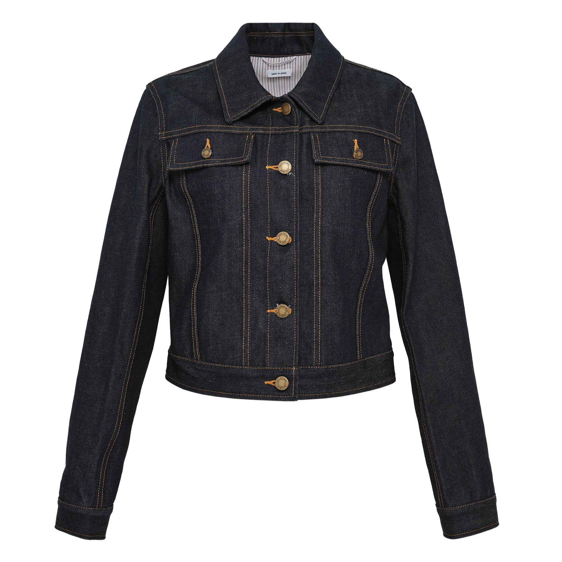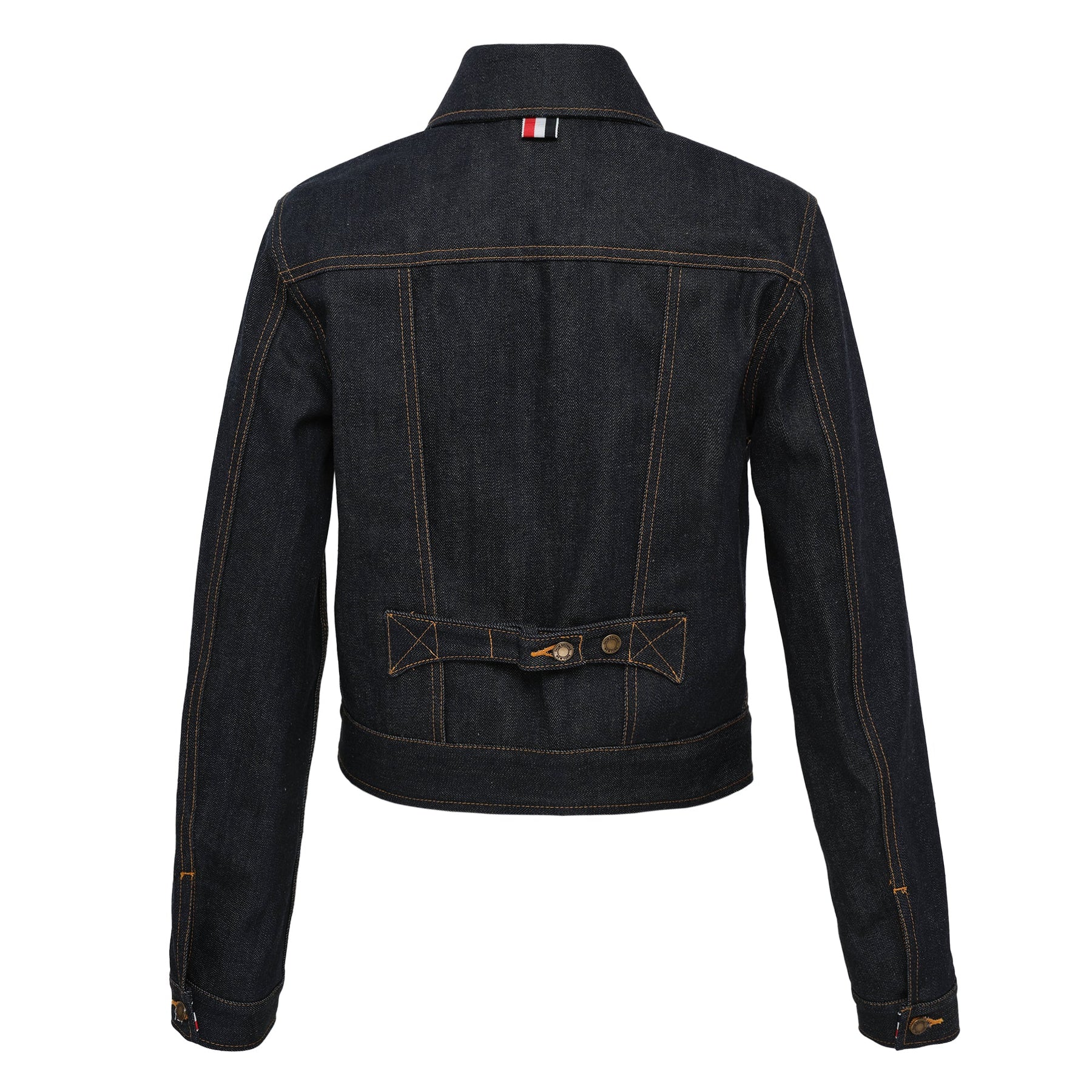 The Thom Browne Shrunken Fit Denim Jacket delivers tailored luxury with signature cropped proportions and refined construction. Crafted from premium indigo denim with contrast stitching and antique brass hardware, featuring the brand's signature shrunken silhouette. The structured fit and meticulous detailing create a sophisticated take on classic Americana workwear.