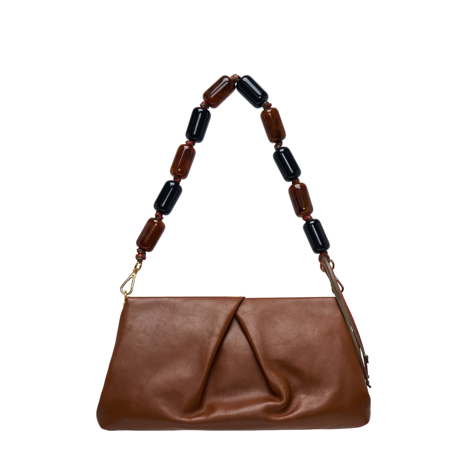 Dries Van Noten Small Pleat Clutch delivers sophisticated elegance with versatile carrying options. Crafted from premium cognac-brown leather with signature pleated front panel detailing and polished gold-tone hardware. The detachable beaded chain strap transforms the piece from clutch to shoulder bag, embodying the brand's commitment to refined Belgian craftsmanship.
