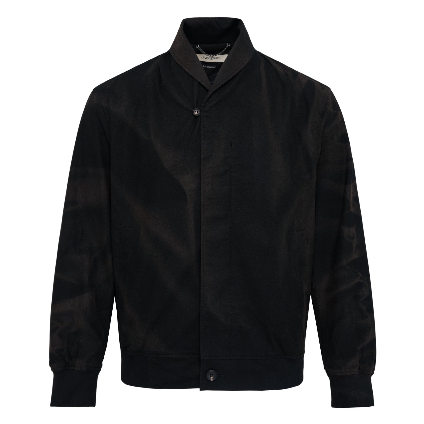 The JiyongKim Sun-Bleached Shawl Collar Jacket delivers contemporary Korean design with vintage-inspired detailing and modern silhouette. Crafted from premium cotton blend fabric with sun-bleached treatment in deep black, featuring distinctive shawl collar construction and ribbed cuffs. The relaxed bomber silhouette and artisanal bleaching process create a unique statement piece with subtle texture variation.
