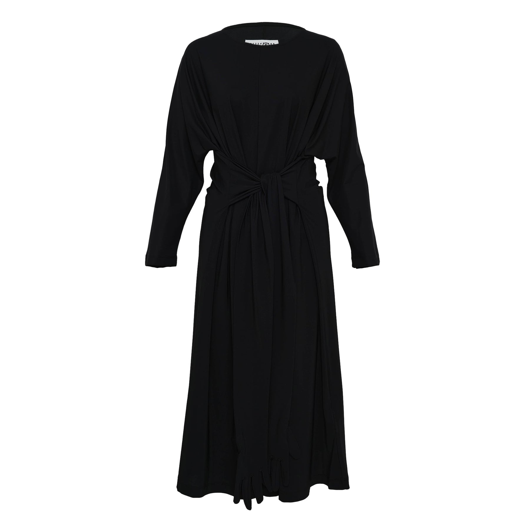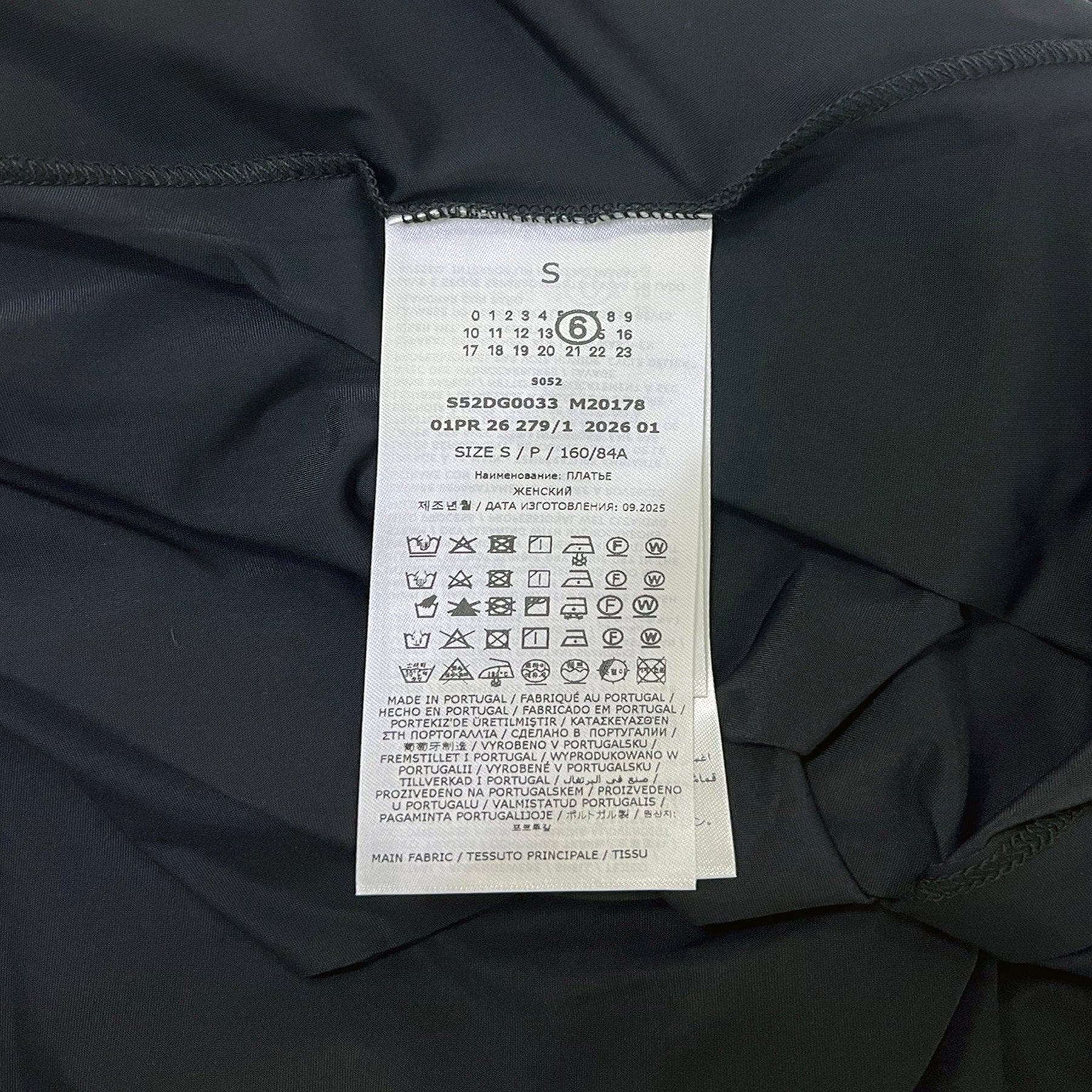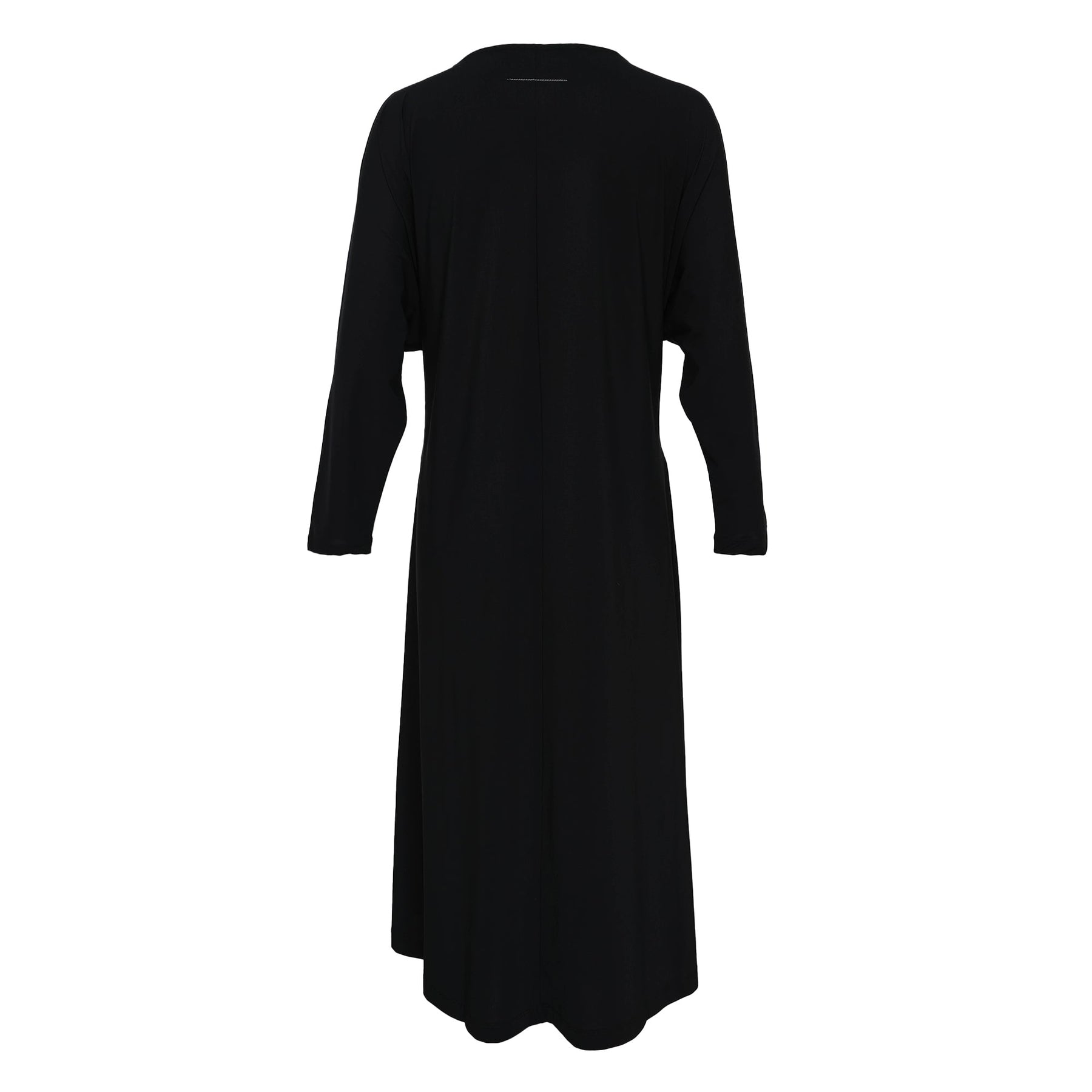 MM6 Tie Maxi Dress delivers effortless elegance with modern comfort and versatile styling. Crafted from premium stretch lycra jersey in classic black, featuring a flattering tie-front detail that creates a customizable silhouette. The fluid drape and comfortable stretch construction make this dress perfect for day-to-evening transitions.