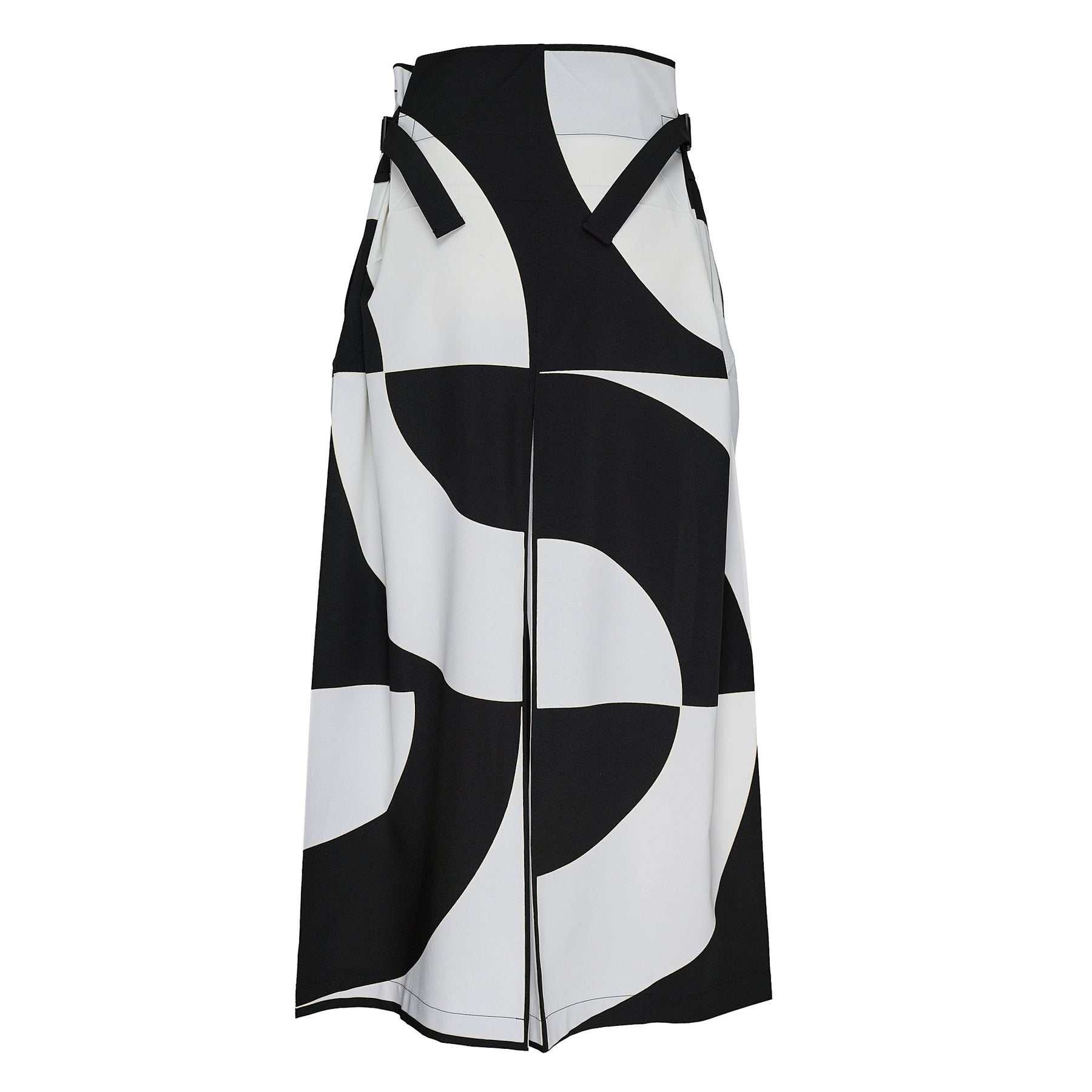 CIRCULAR TILES features a bold pattern created by drawing a circle within a square, dividing it into four parts, then rotating and combining them. The silhouette is linear, and it is designed to form a tile when folded.
