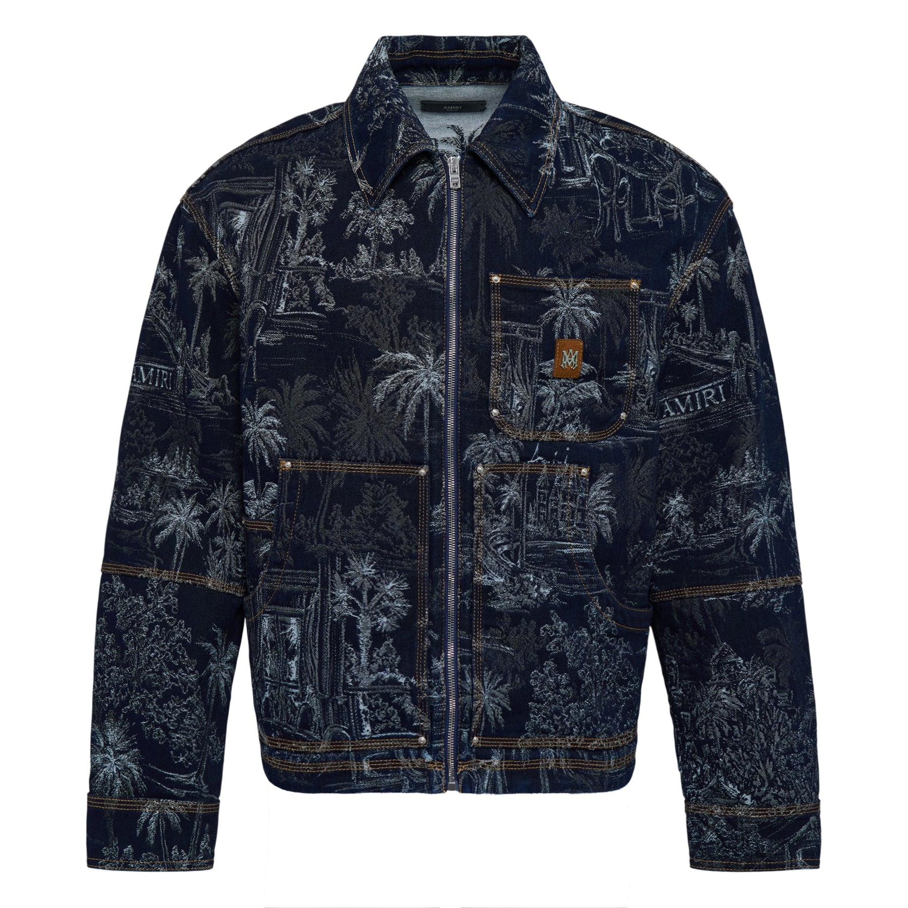 AMIRI Chateau Palms Jacquard Jacket delivers luxury streetwear with intricate tropical artistry and premium construction. Crafted from jacquard denim featuring all-over palm tree motifs in tonal navy, with signature contrast stitching and zip closure detailing. The structured silhouette and signature AMIRI craftsmanship create a statement piece for contemporary luxury wardrobes.