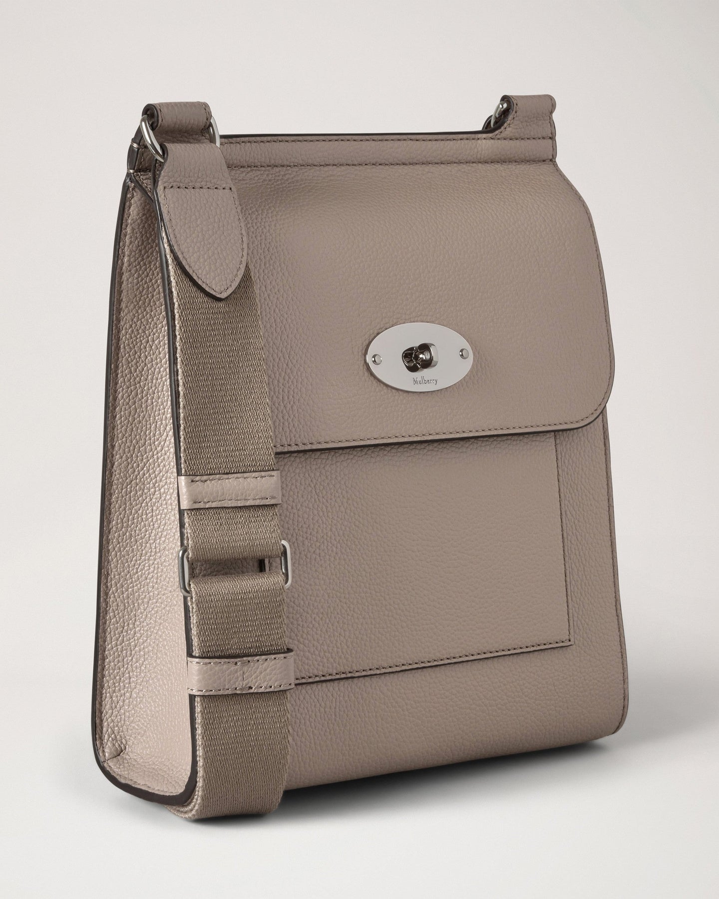 The Mulberry Antony crossbody bag delivers timeless British luxury with practical everyday functionality. Crafted from signature small classic grain leather in sophisticated stone gray, featuring the iconic postman's lock closure and adjustable webbing strap. The structured silhouette and premium leather construction create an enduring piece for modern wardrobes.