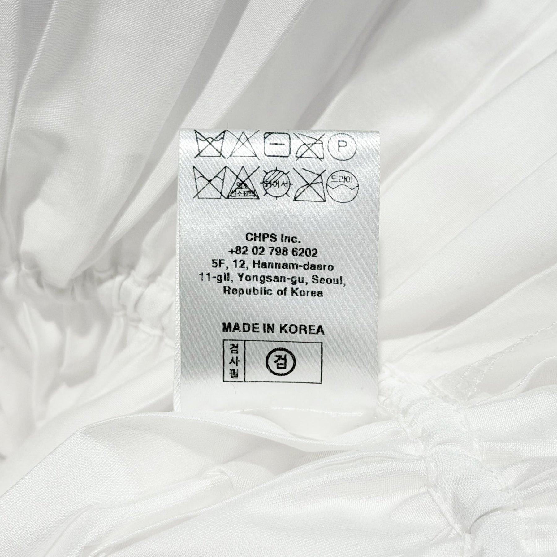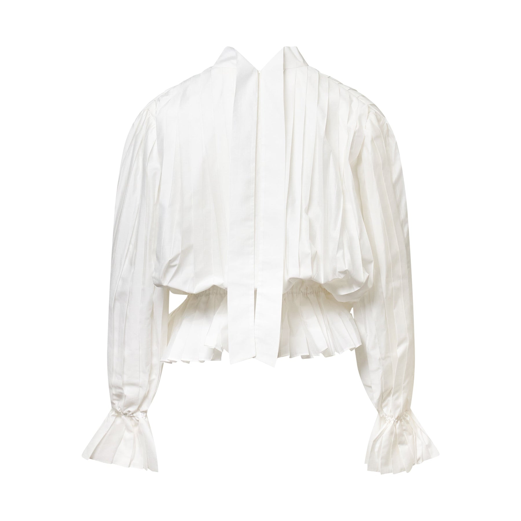 The YCH Bralette Pleat Blouse delivers modern femininity with structured pleating and contemporary silhouette. Crafted from lightweight crisp cotton in pristine white, featuring gathered elastic waist and fluted cuff details. The wrap-style construction and pleated front panel create an elevated essential for sophisticated styling.