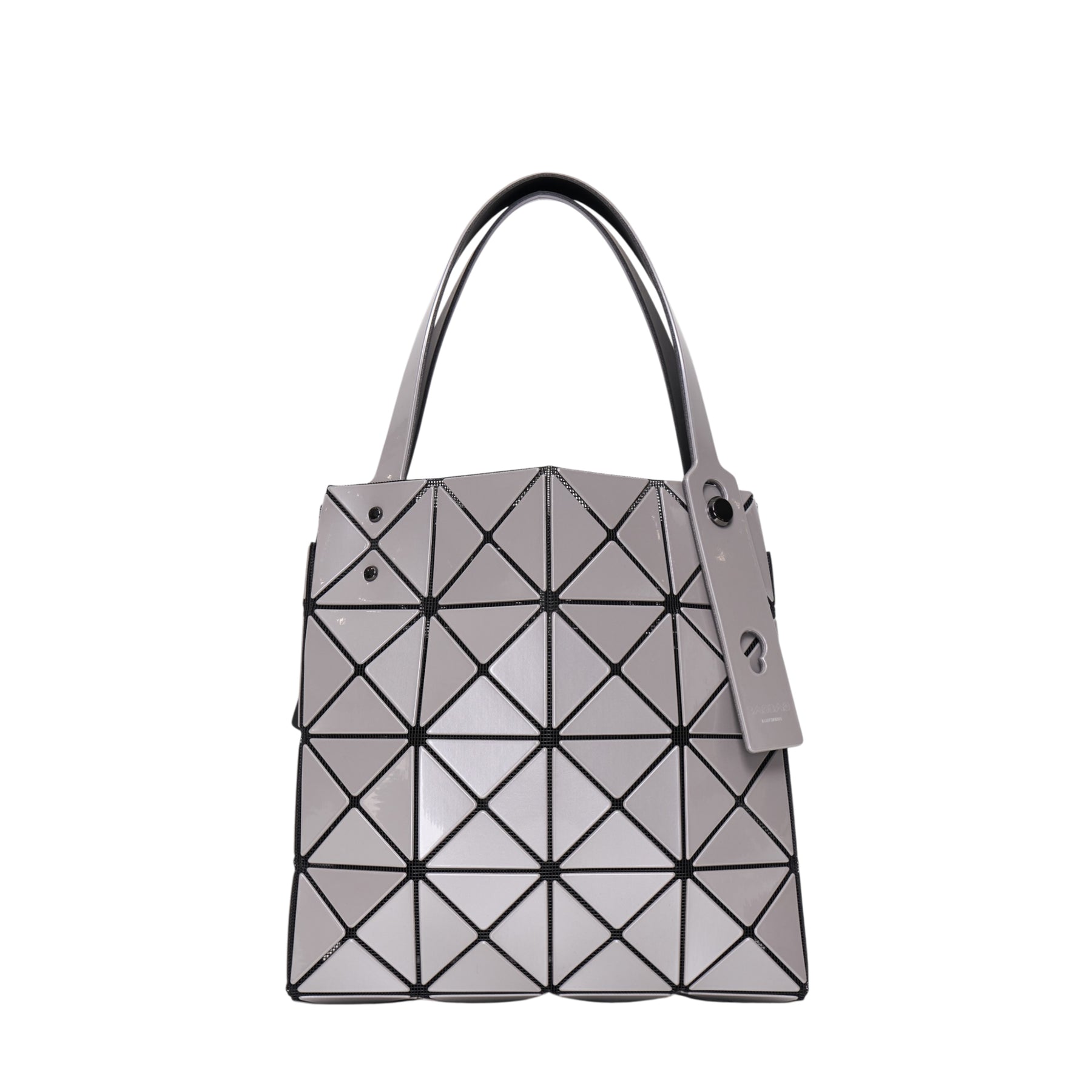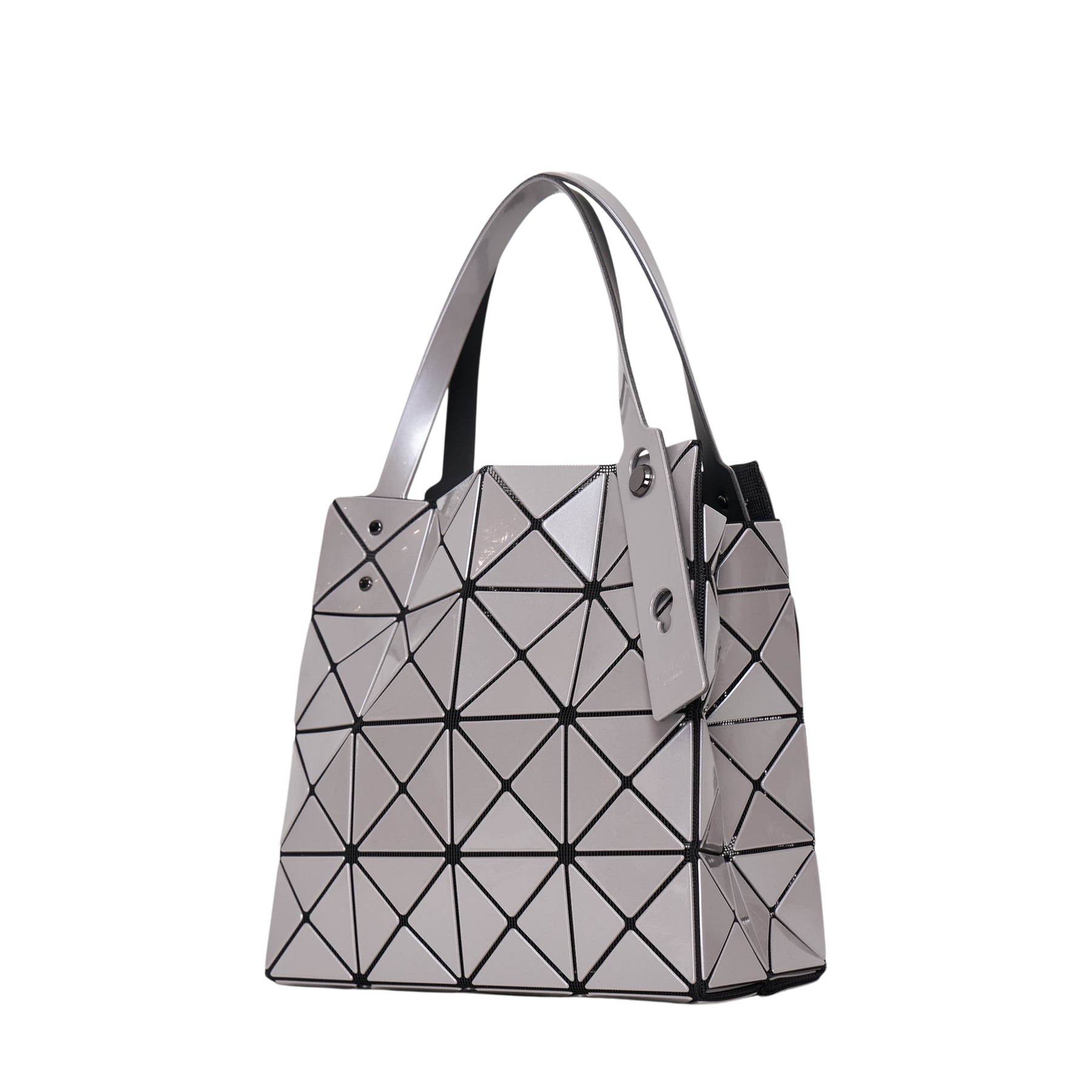 BAO BAO ISSEY MIYAKE Carat Top Handle Large delivers innovative geometric design with transformative structure and everyday functionality. Crafted from signature triangular PVC panels in sophisticated matte gray, featuring the brand's iconic geometric grid pattern that shifts and moves with use. The architectural construction and flexible form create a unique sculptural accessory that adapts to contents while maintaining its distinctive silhouette.