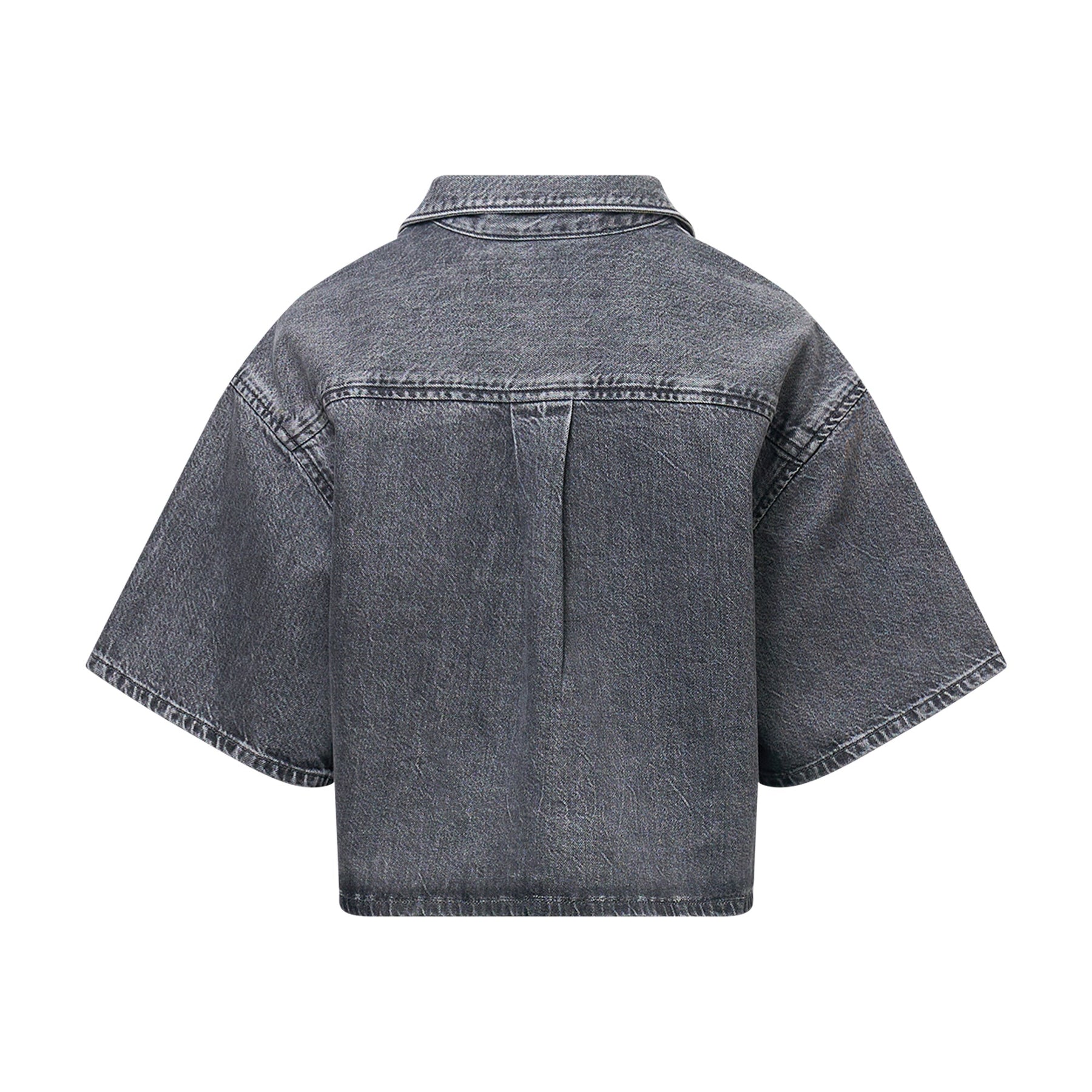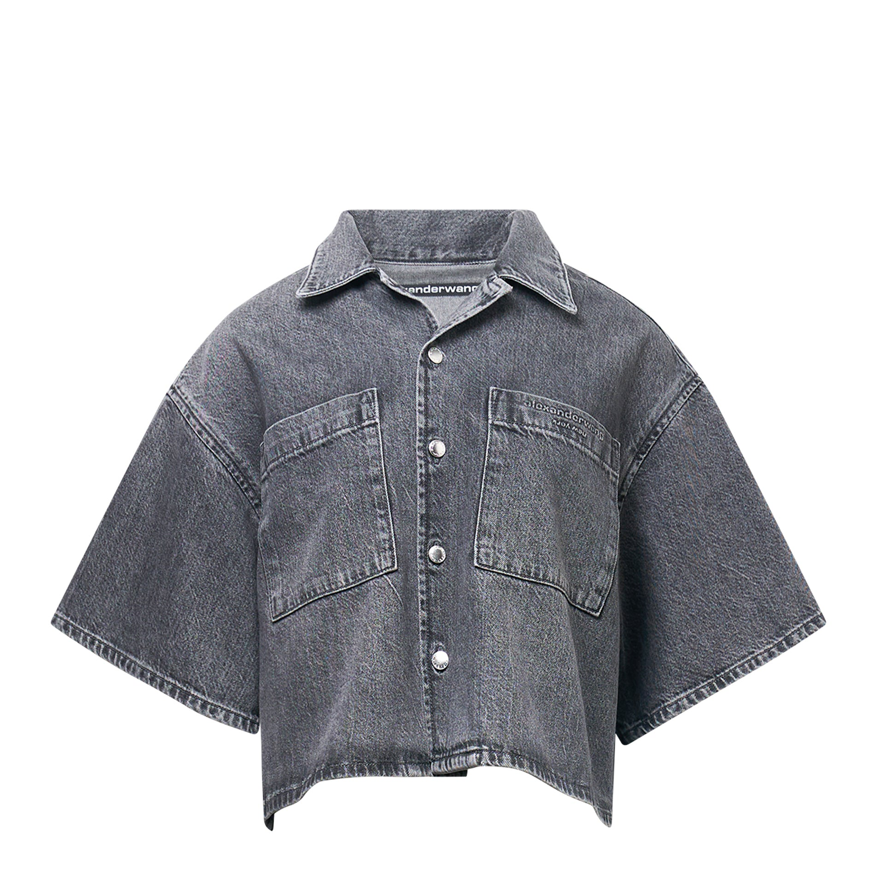 Alexander Wang Cropped Short Sleeve Shirt delivers contemporary edge with structured denim-inspired design and modern proportions. Crafted from washed cotton in sophisticated charcoal gray, featuring chest patch pockets and silver-toned snap button closure throughout. The cropped silhouette and oversized fit create a bold statement piece that defines Alexander Wang's urban aesthetic.