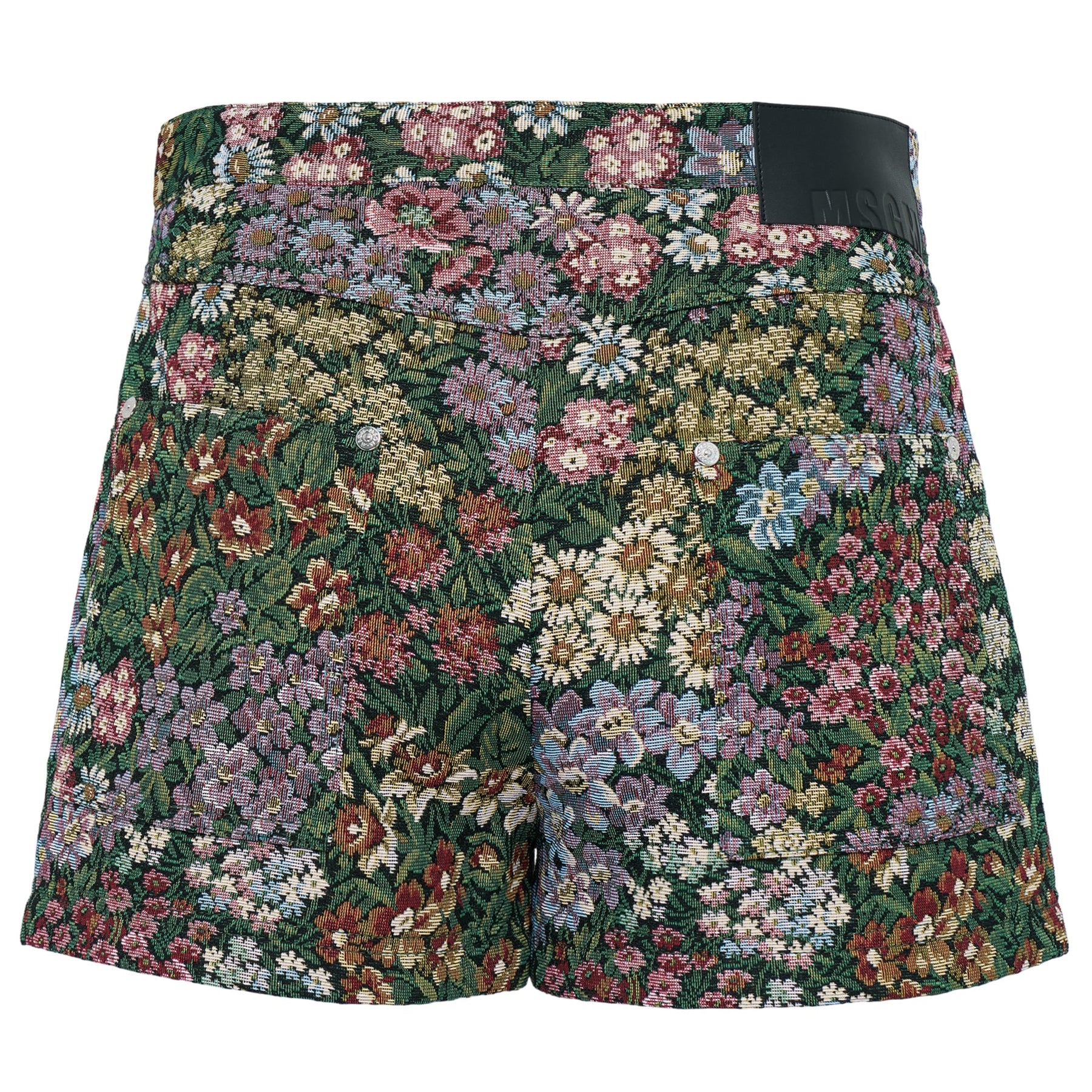 MSGM Garden Gobeline Shorts deliver Italian luxury with intricate floral jacquard craftsmanship. Constructed from premium tapestry-style fabric featuring a vibrant botanical print in rich greens, pinks, and golds with decorative button detailing. The high-waisted silhouette and structured finish create an elevated piece perfect for sophisticated casual styling.