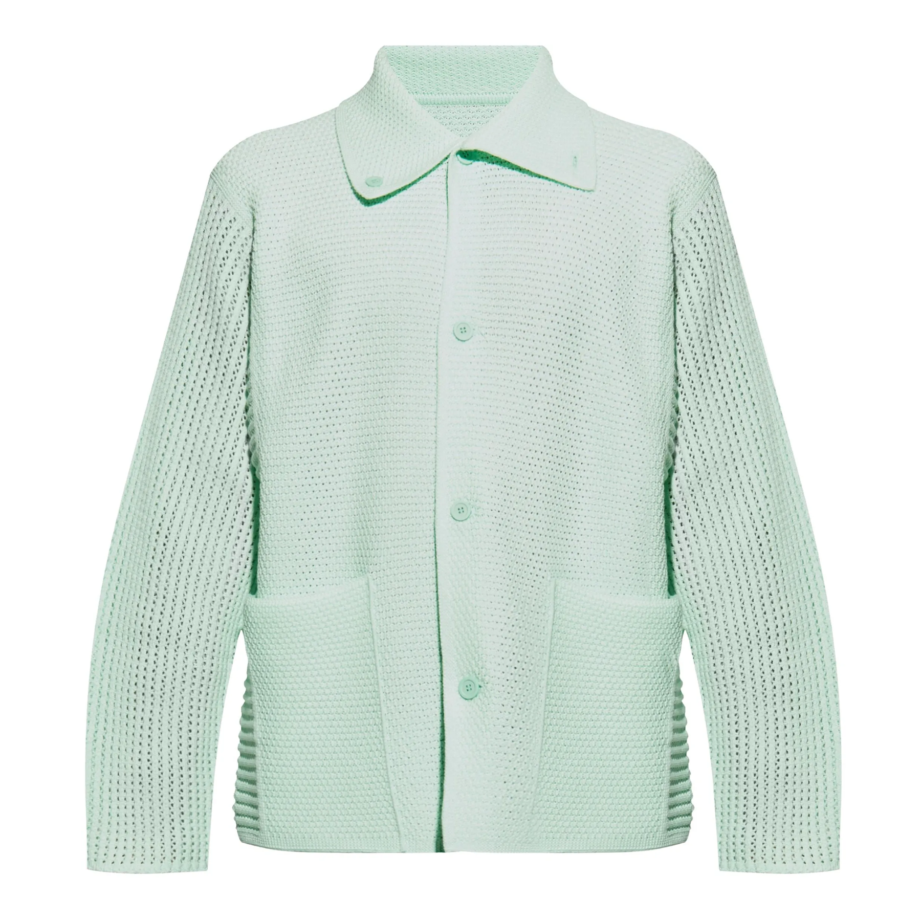 This knit jacket is characterized by its varied silhouette combining standard knitted fabric and ribbing. It has pockets on both sides.