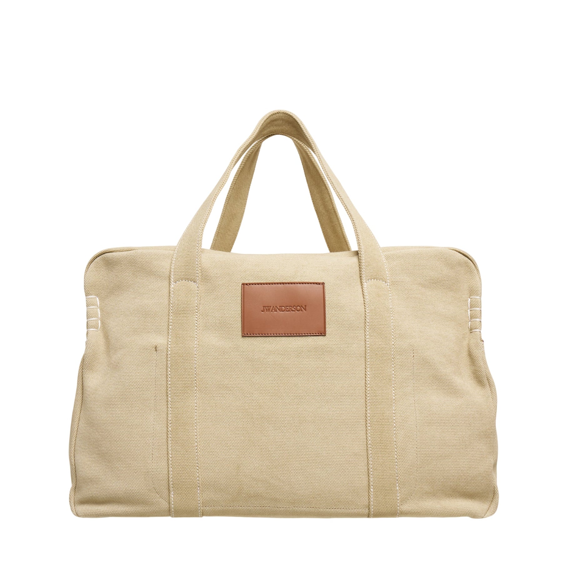 The JW Anderson Weekender Bag delivers sophisticated travel functionality with contemporary British design. Crafted from durable canvas in neutral beige with leather accents, featuring structured construction and reinforced handles for everyday durability. The signature JW Anderson leather patch and minimalist aesthetic create a versatile companion for weekend getaways and daily use.