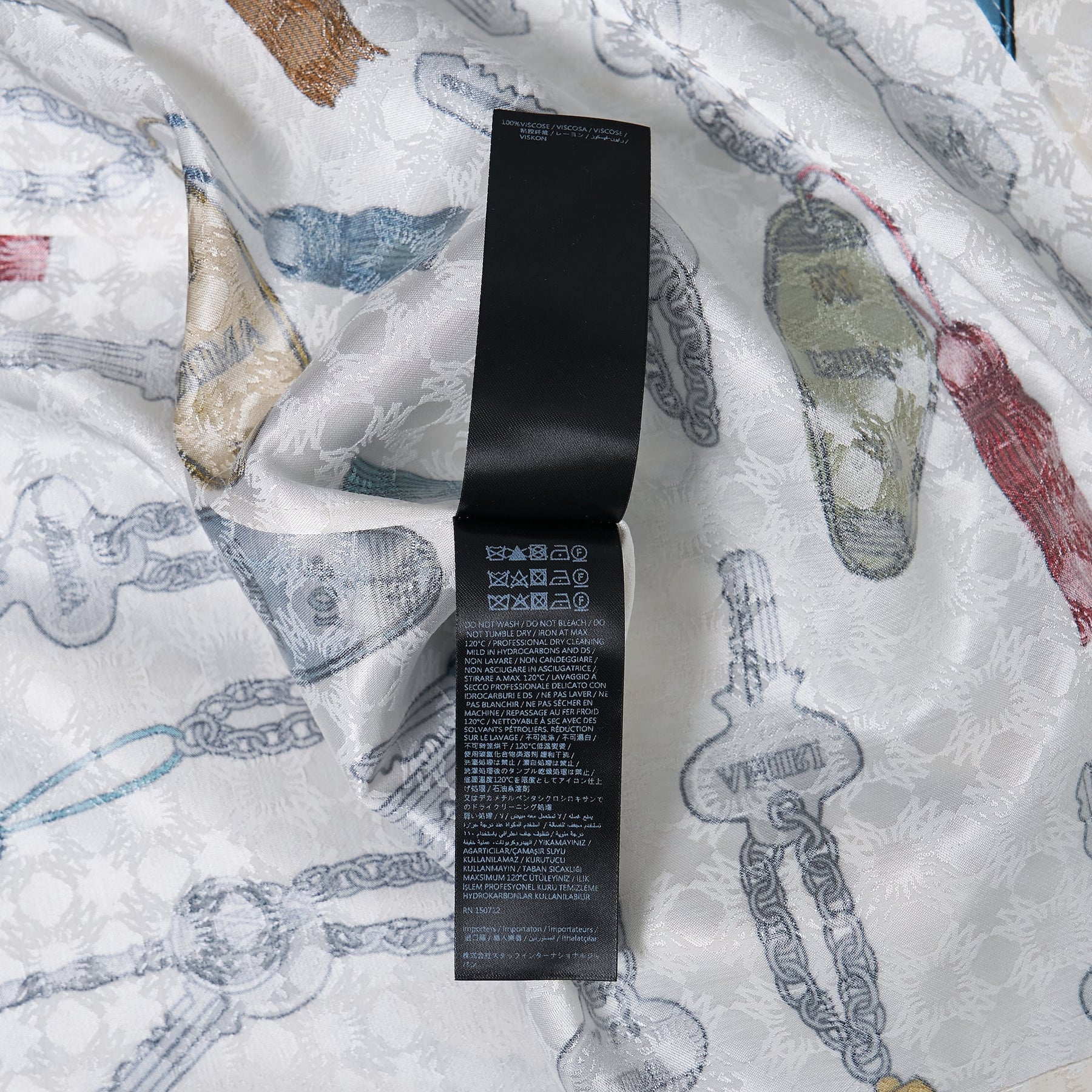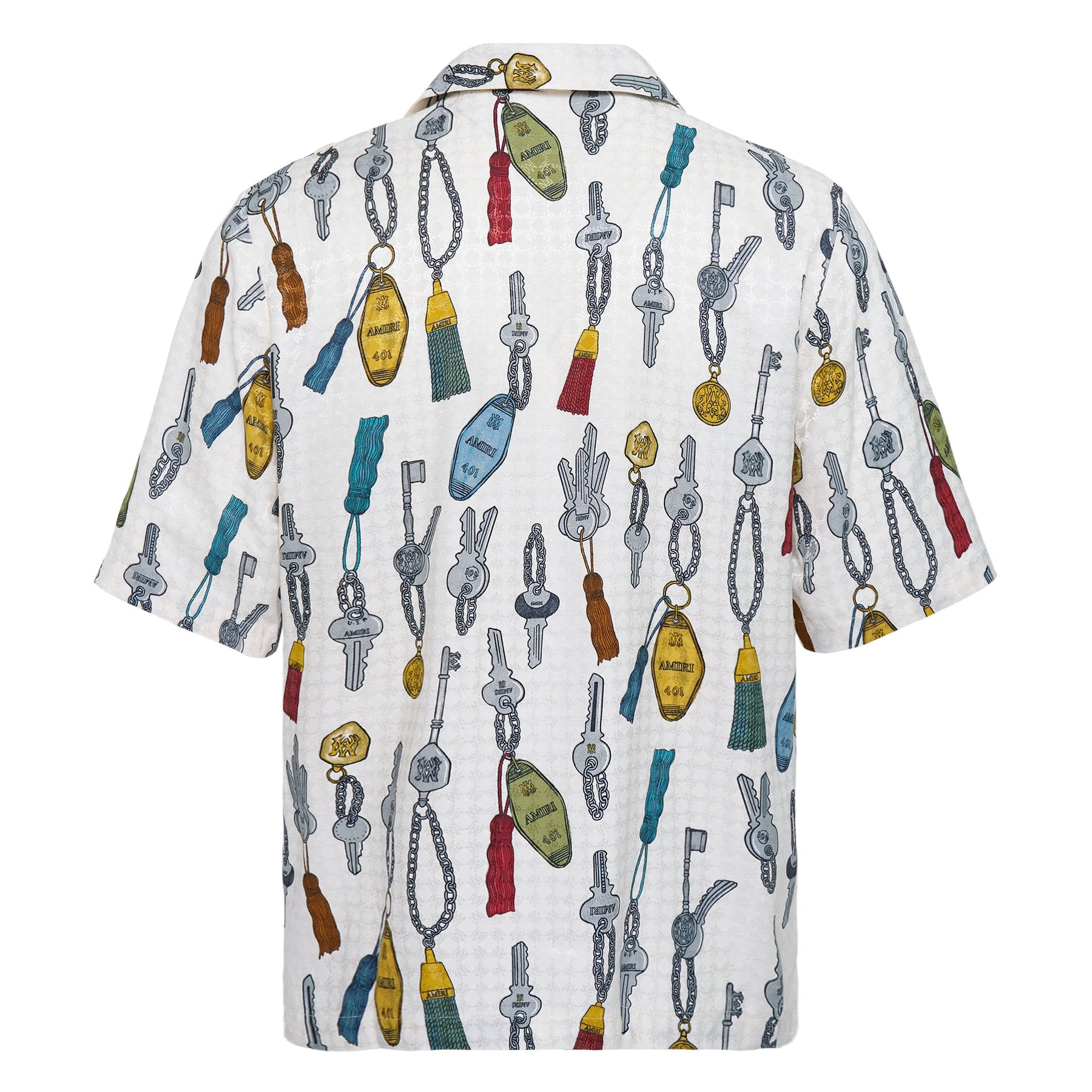The AMIRI Keys Camp Shirt delivers luxury streetwear with playful graphic storytelling and premium construction. Crafted from lightweight cotton poplin in crisp white, featuring an all-over vintage key and charm print in vibrant colors throughout. The relaxed camp collar silhouette and signature AMIRI attention to detail create a statement piece that bridges casual sophistication with contemporary edge.