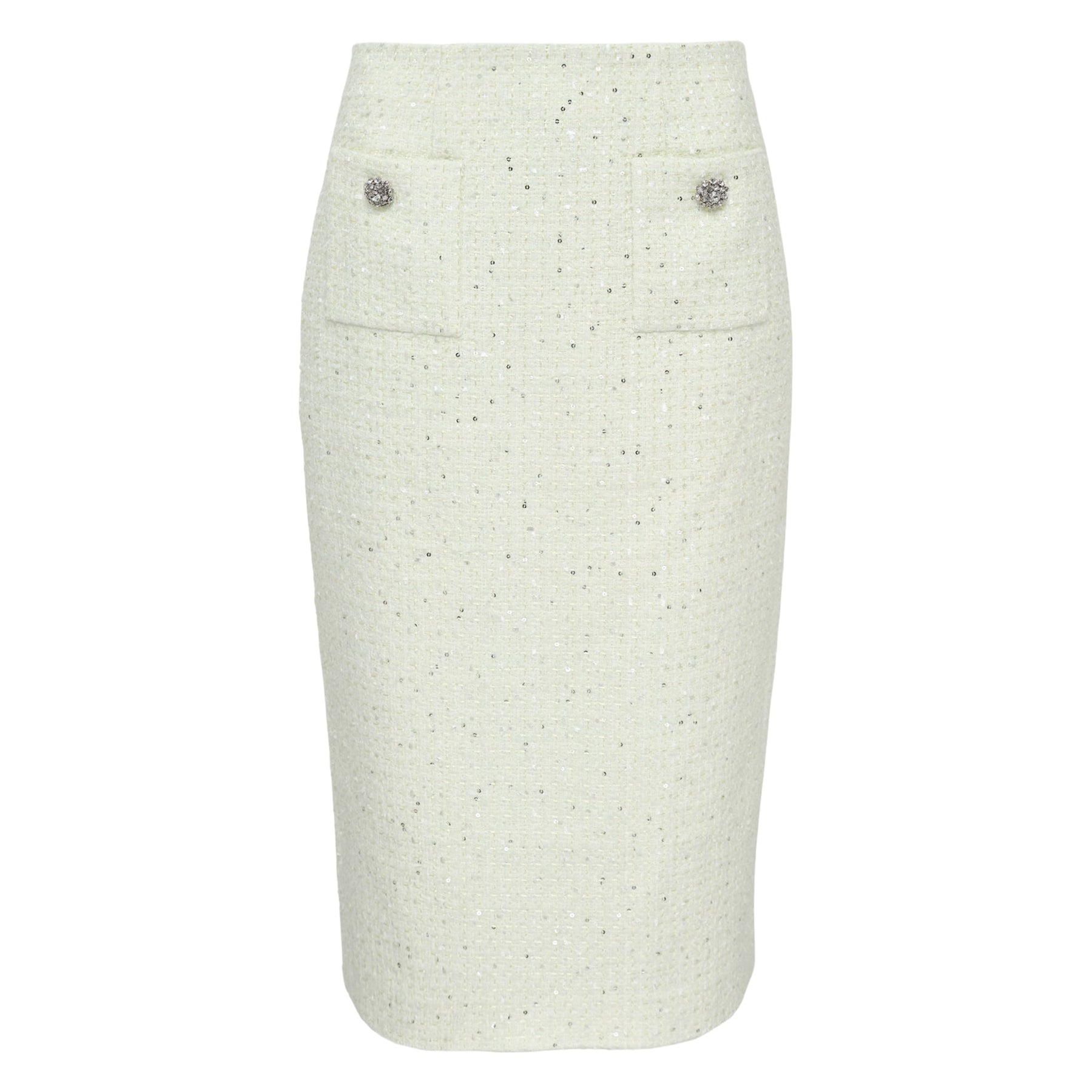 The Self-Portrait Lime Boucle Midi Skirt delivers sophisticated elegance with contemporary feminine appeal. Crafted from premium boucle tweed in fresh lime green with subtle metallic threading, featuring crystal-embellished button details and a flattering high-waisted silhouette. The structured midi length and signature Self-Portrait craftsmanship create a refined statement piece for special occasions.