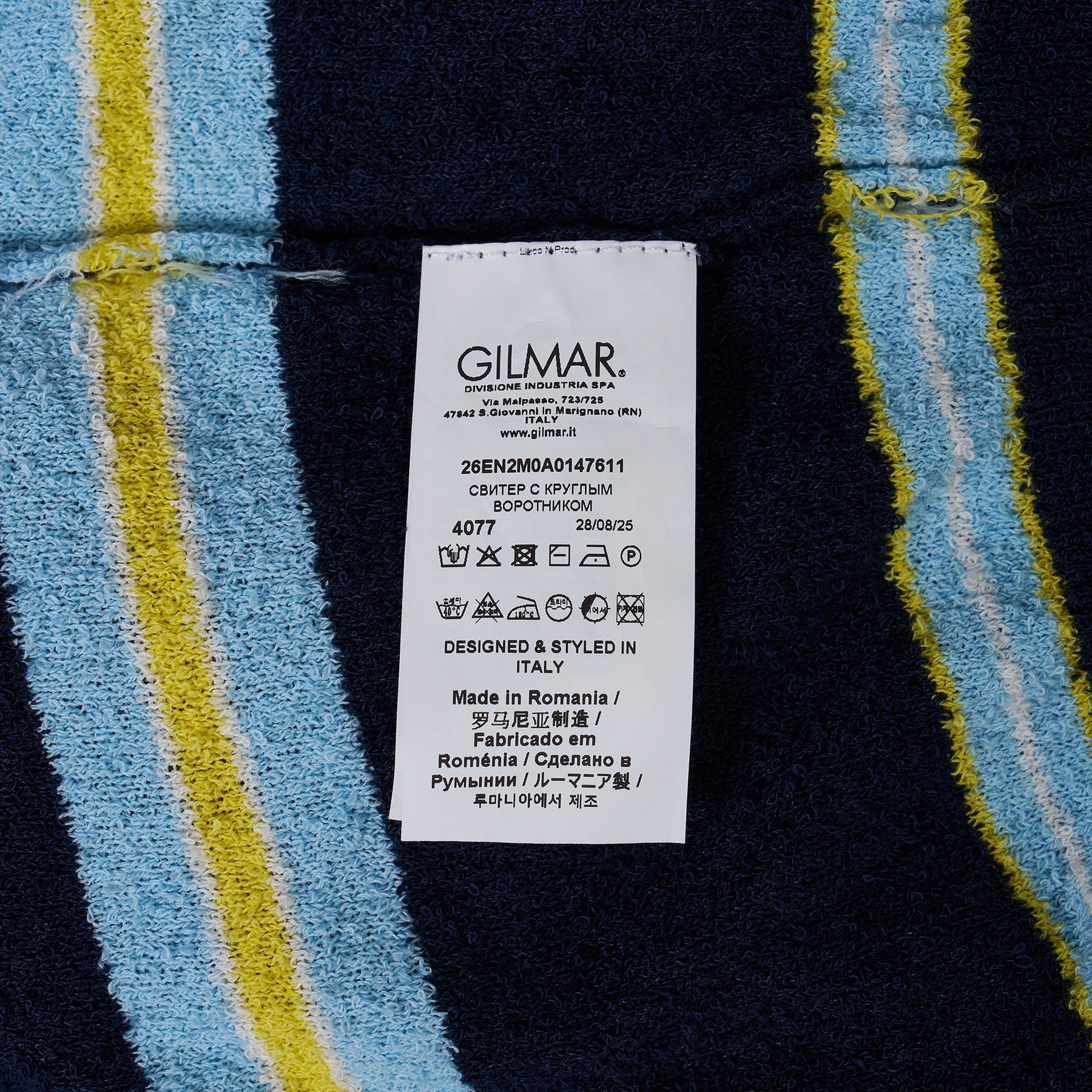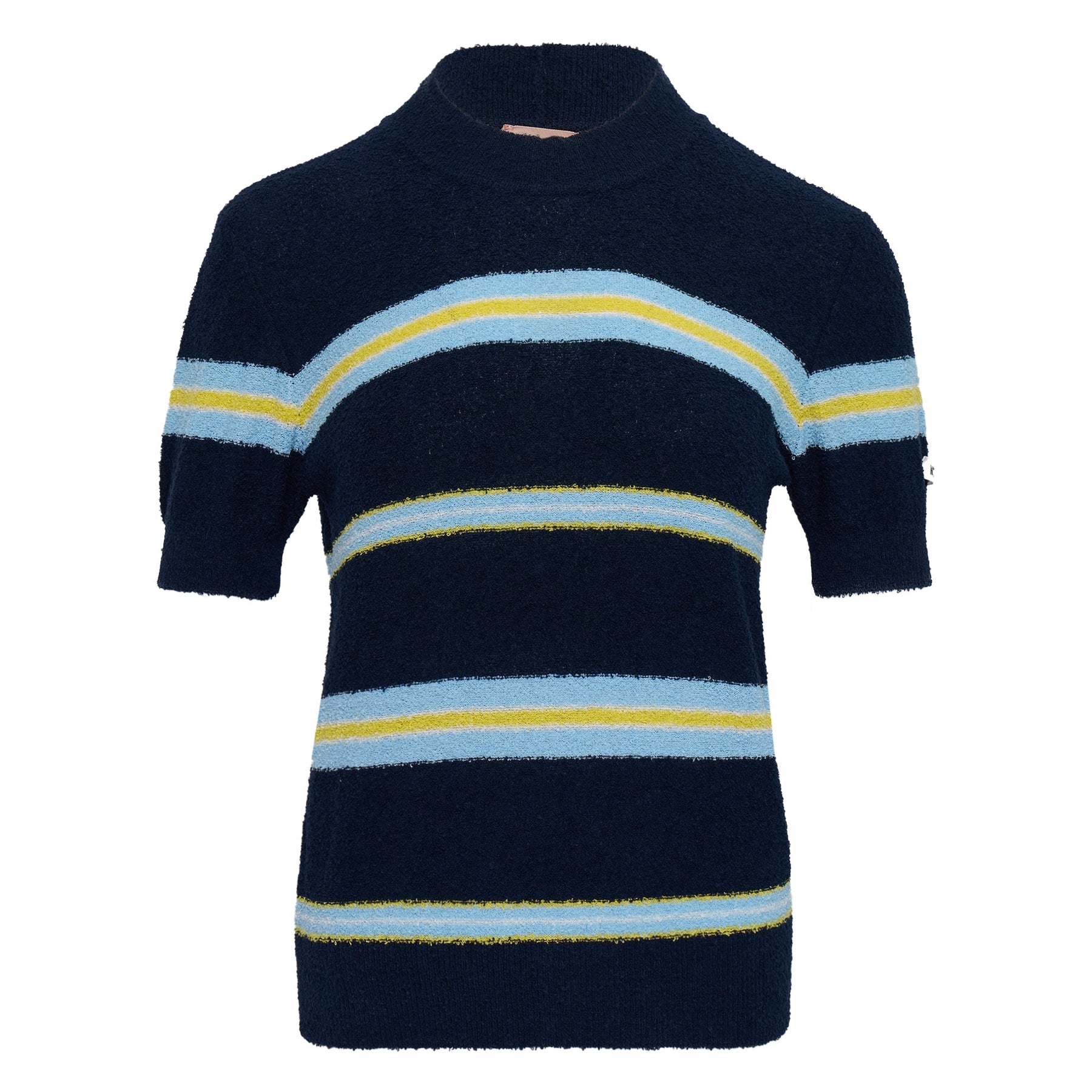 The N21 Maglia Girocollo delivers contemporary Italian knitwear with sophisticated striped detailing and refined construction. Crafted from soft knit fabric in navy blue with contrasting light blue and yellow stripe accents throughout. The classic crew neck silhouette and textured finish create a versatile piece that embodies N21's modern aesthetic.