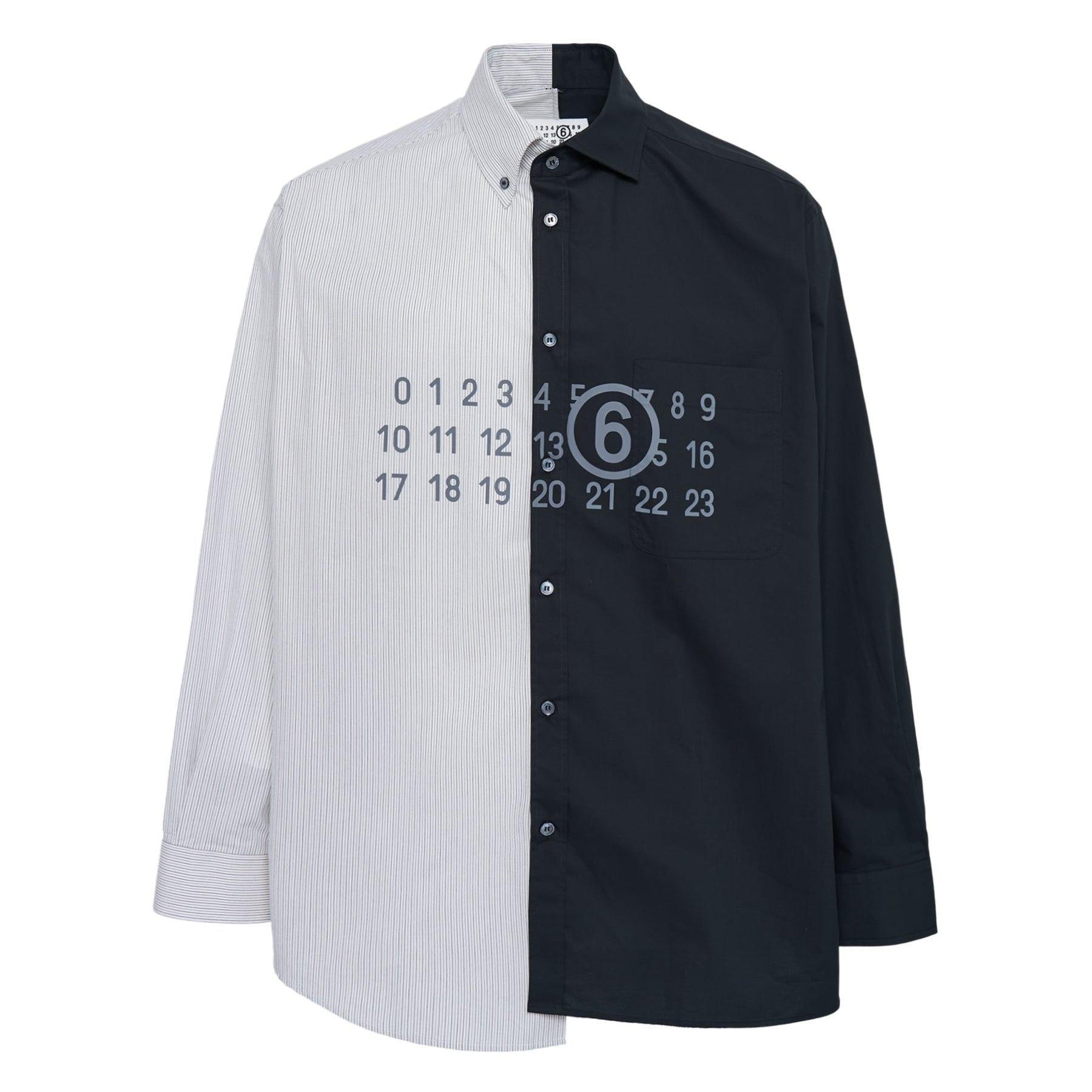 The MM6 Long-Sleeved Poplin Shirt delivers contemporary sophistication with conceptual design elements and premium construction. Crafted from crisp cotton poplin with contrasting panels and numerical print graphics, featuring the brand's signature deconstructed aesthetic. The asymmetrical color-blocking and architectural silhouette create a statement piece that bridges minimalism with avant-garde styling.