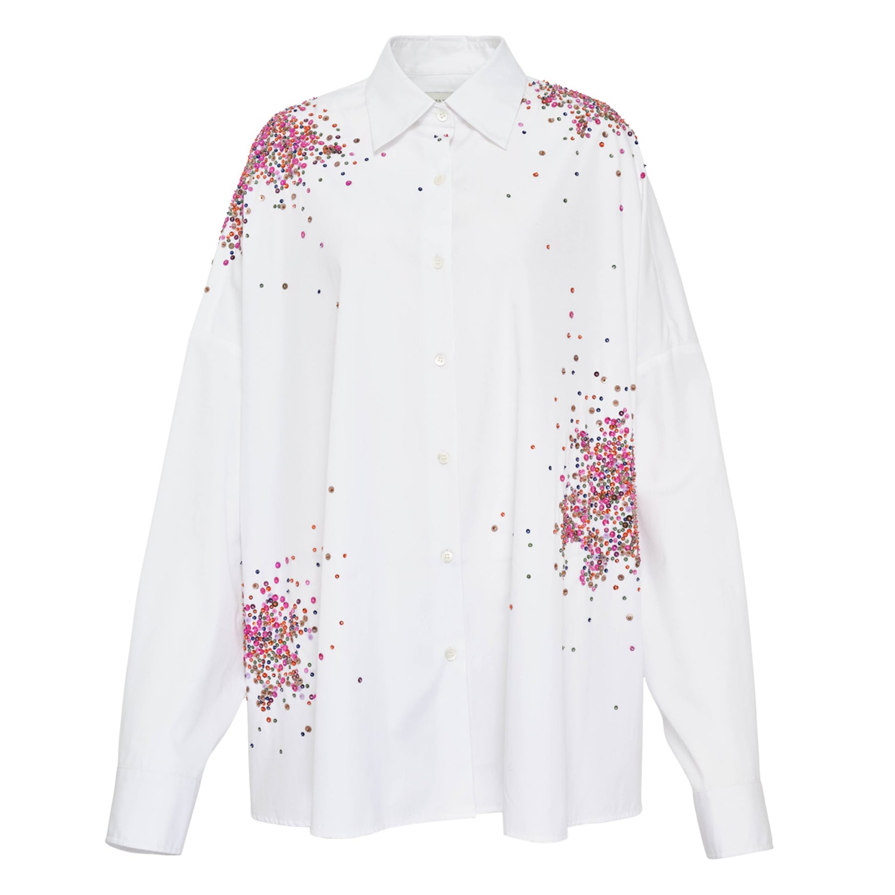 The Dries Van Noten Oversized Cocoon Shirt delivers artistic elegance with contemporary silhouette and hand-embellished detailing. Crafted from crisp white cotton poplin featuring multicolored sequin embellishments in pink, purple, and gold tones scattered across the design. The oversized cocoon cut and signature Van Noten artisanal approach create a statement piece that bridges art and fashion.