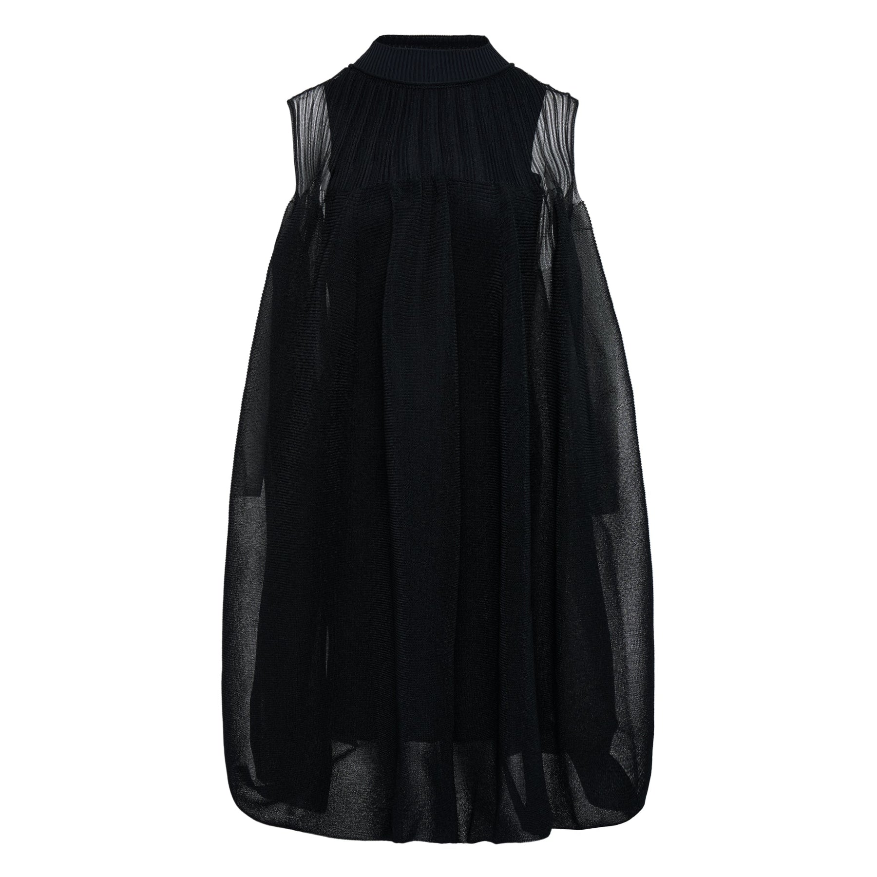 CFCL Overwrapped Pottery Bust Flare delivers innovative knitwear construction with architectural draping and sculptural silhouette. Crafted from technical black mesh fabric with ribbed turtleneck detailing, featuring the brand's signature computer-programmed knitting techniques. The dramatic flared silhouette and layered construction create a contemporary statement piece that bridges fashion and technology.