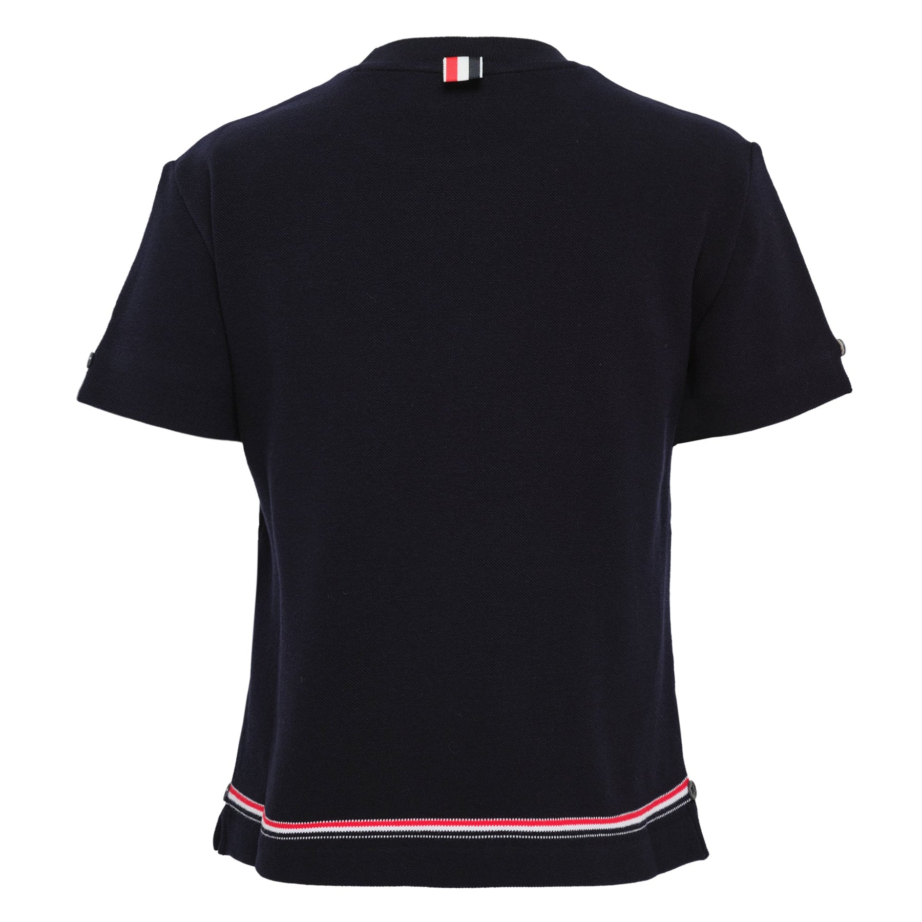 The Thom Browne Short Sleeve Notch Tee delivers sophisticated luxury with the brand's signature preppy aesthetic. Crafted from premium cotton knit in classic navy, featuring the iconic tricolor grosgrain trim at the hem and signature white label patch. The refined notch collar construction and tailored fit embody Thom Browne's distinctive American craftsmanship.