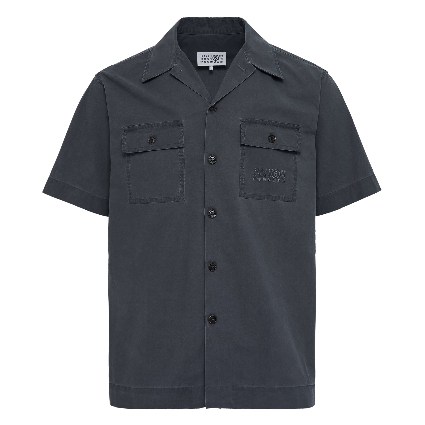 MM6 Short Sleeve Washed Cotton Shirt delivers contemporary minimalism with relaxed tailoring and premium construction. Crafted from pre-washed cotton in sophisticated charcoal gray with a lived-in texture and soft hand-feel. The camp collar design and dual chest pockets create a versatile piece that bridges casual and elevated dressing.