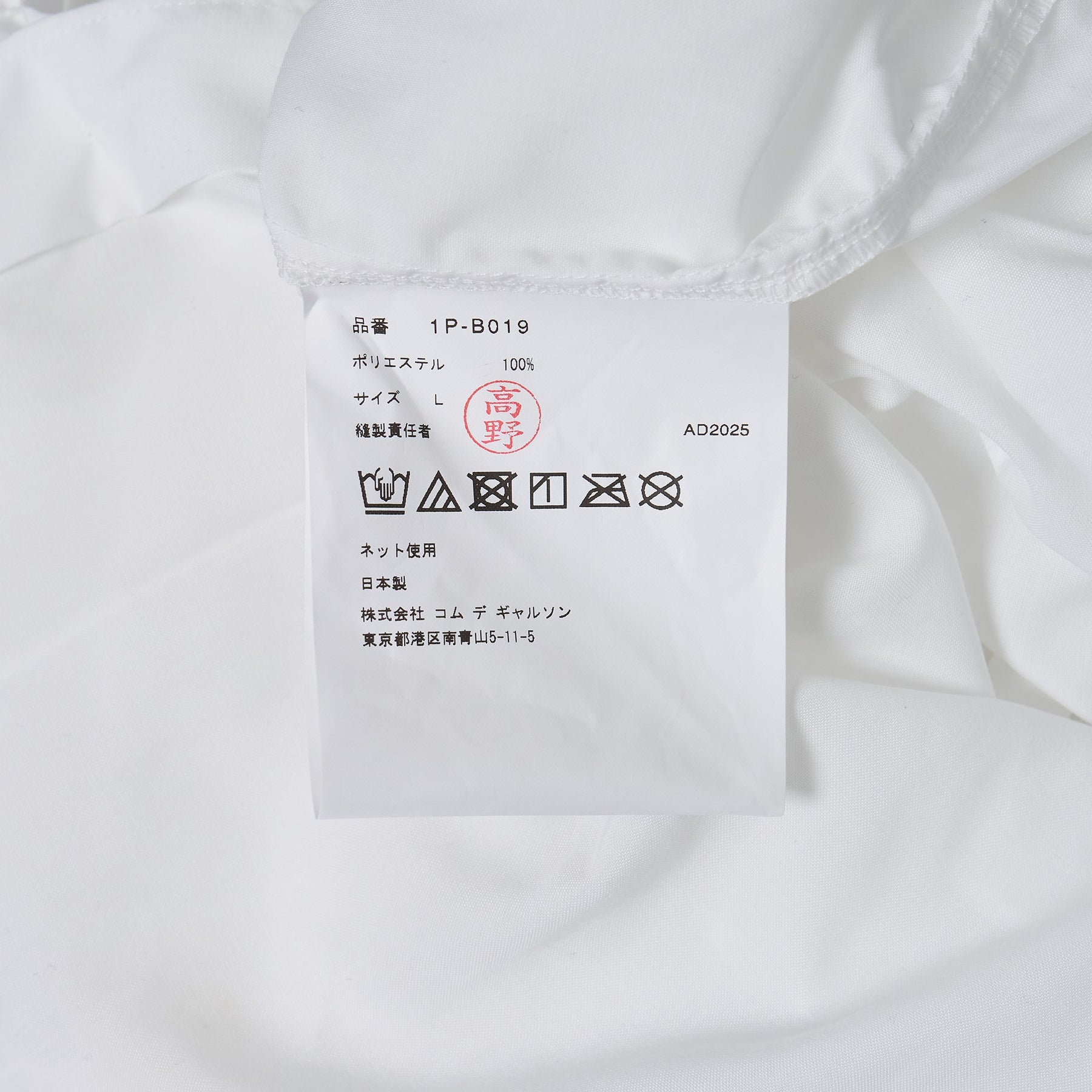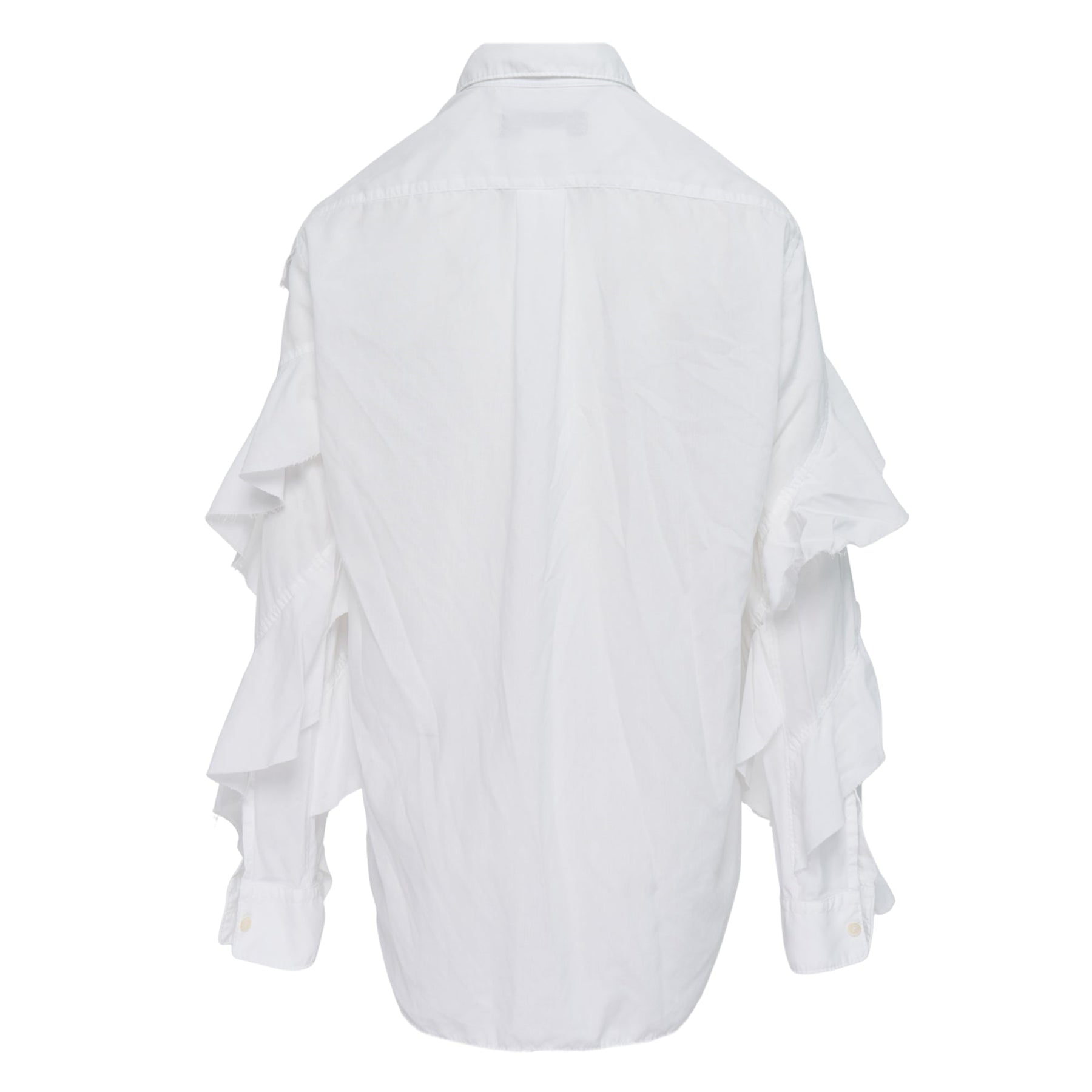 COMME des GARCONS BLACK Spun Broad Ruffled Sleeve Shirt delivers avant-garde femininity with architectural volume and dramatic silhouette construction. Crafted from crisp spun broad cotton in pristine white, featuring cascading ruffle details along the sleeves and body. The deconstructed shirt design with oversized proportions creates a statement piece that embodies the brand's experimental approach to classic tailoring.