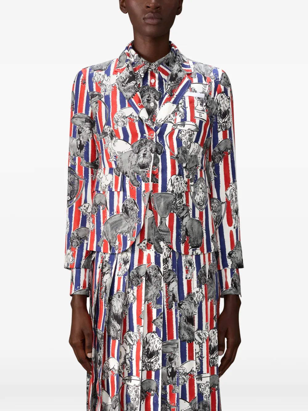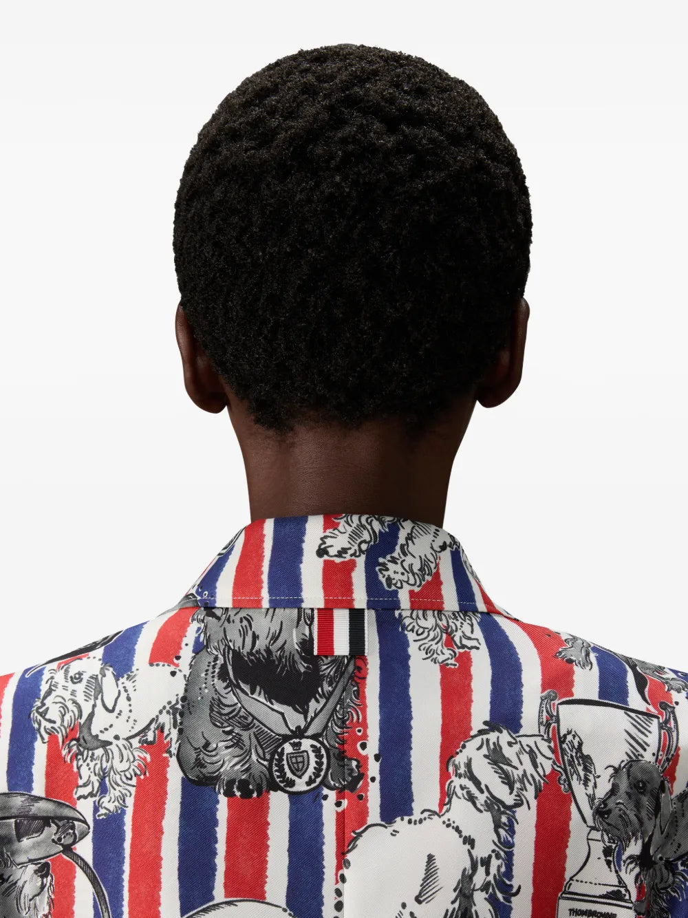 The Thom Browne Fit 3 High Armhole Sportcoat delivers signature tailoring with the brand's distinctive cropped silhouette and precise construction. Crafted with high armhole positioning for enhanced movement and the brand's signature shrunken proportions. Features Thom Browne's iconic tricolor stripe detailing and whimsical dog print throughout for a bold statement piece.