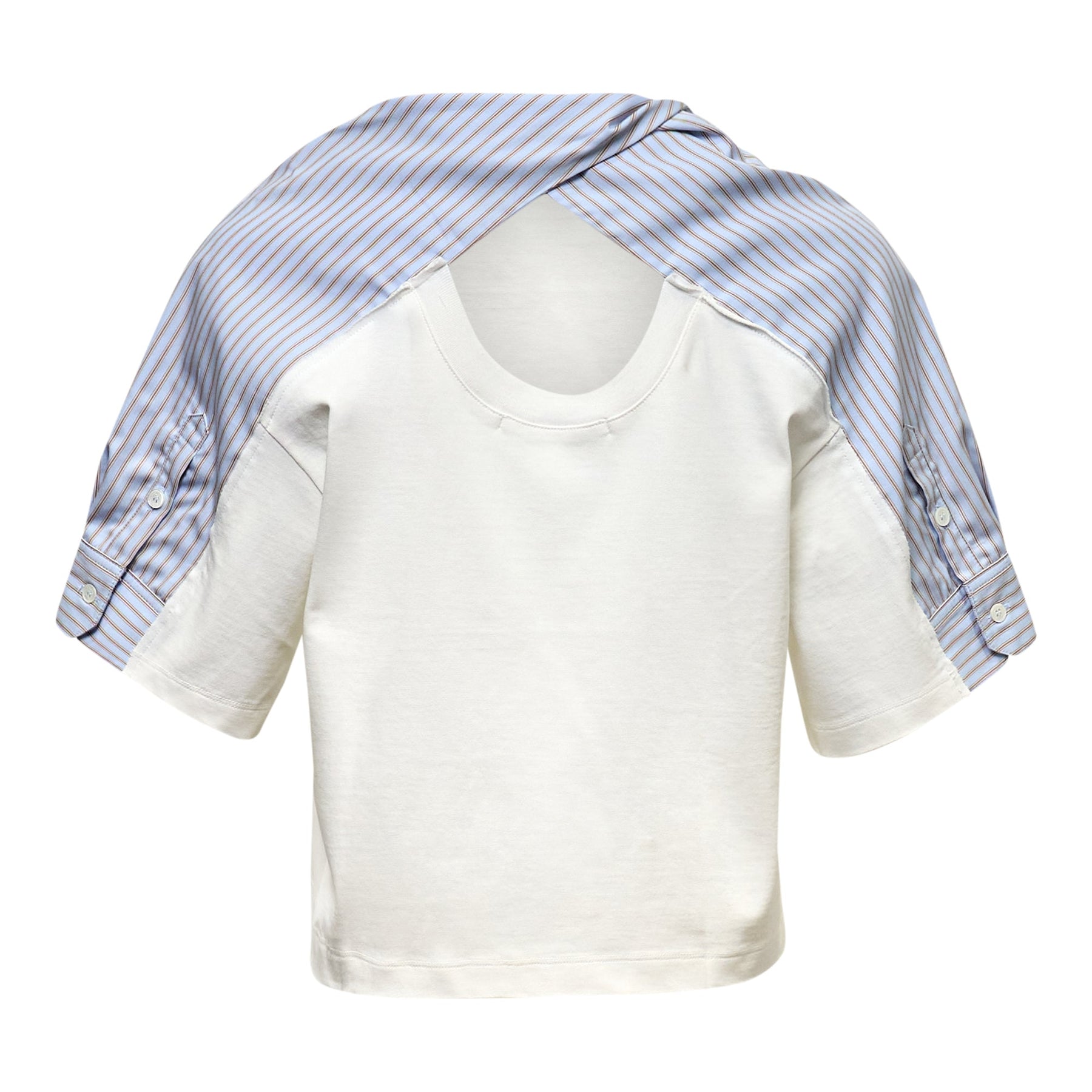 RE;CODE Twisted Stripe Back Top delivers sustainable fashion with innovative upcycled construction and contemporary design. Crafted from premium cotton in soft cream with contrasting blue and white striped panels at the sleeves and back neckline. The twisted back detail and color-blocking create a modern statement piece that embodies the brand's commitment to circular fashion.