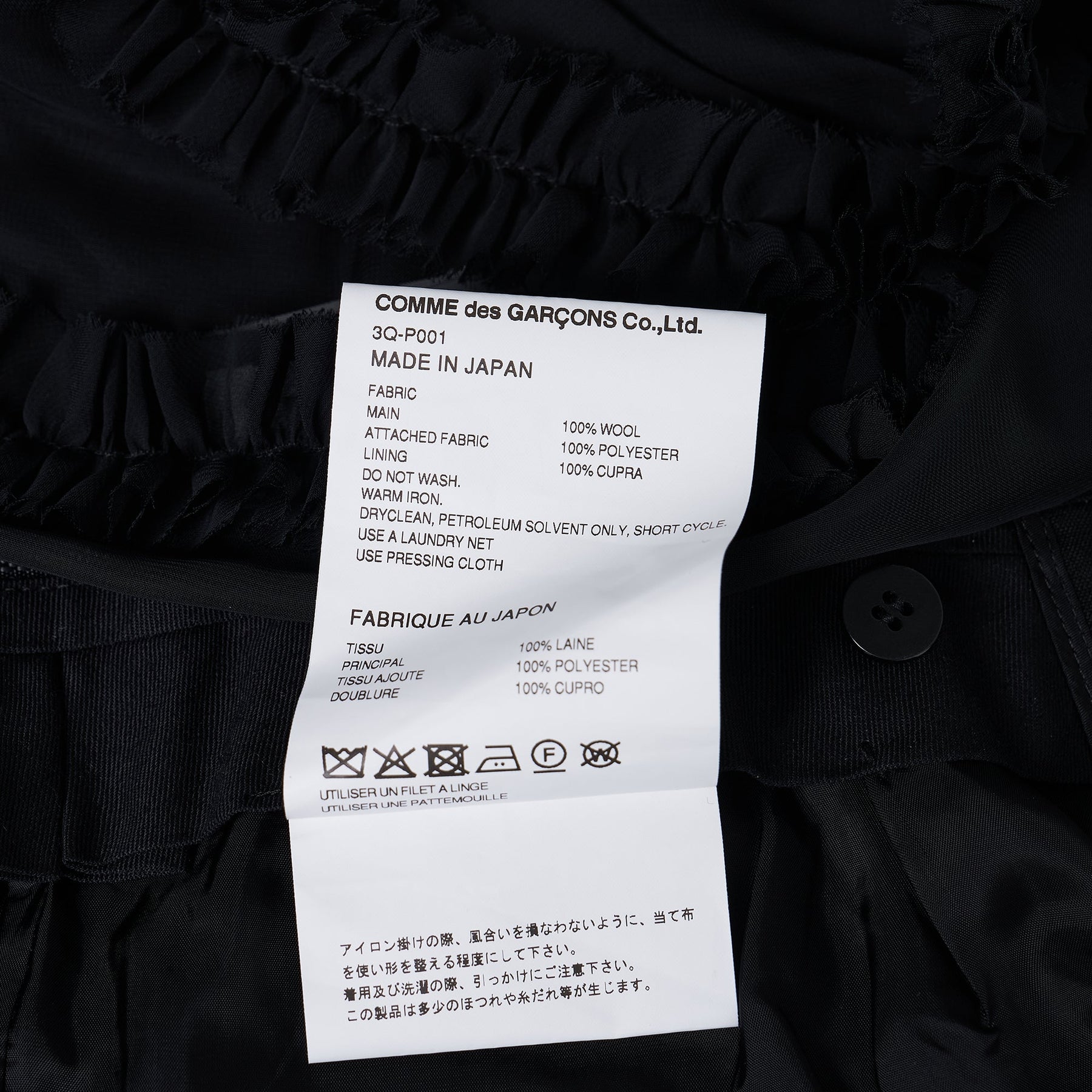 Noir Kei Ninomiya Wool Oxford x Polyester George delivers avant-garde construction with dramatic tulle embellishment and architectural silhouette. Crafted from premium wool oxford blended with polyester for structure and durability, featuring cascading black tulle ruffles that create dynamic movement. The deconstructed design merges formal suiting elements with Rei Kawakubo's protégé's signature experimental approach to feminine form.