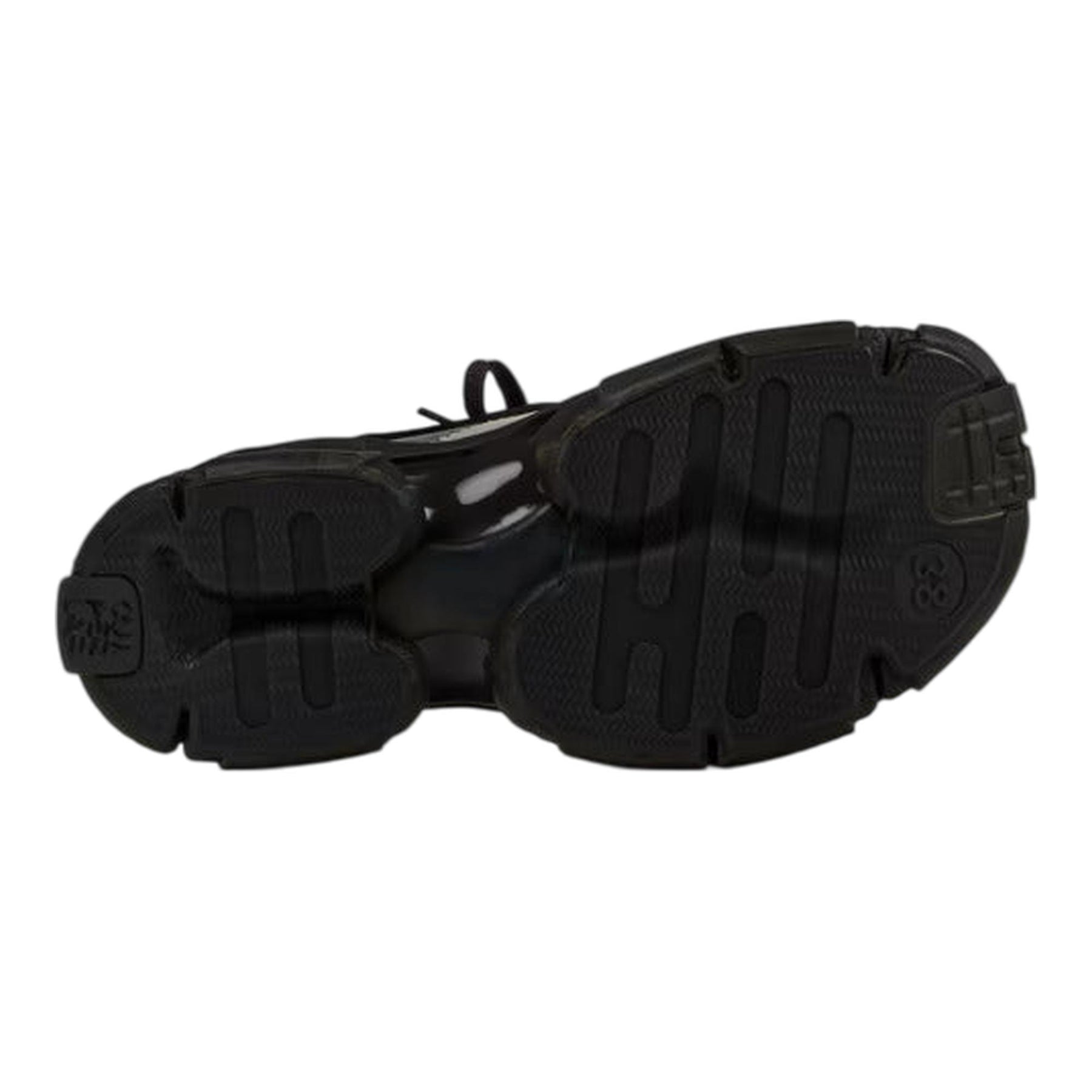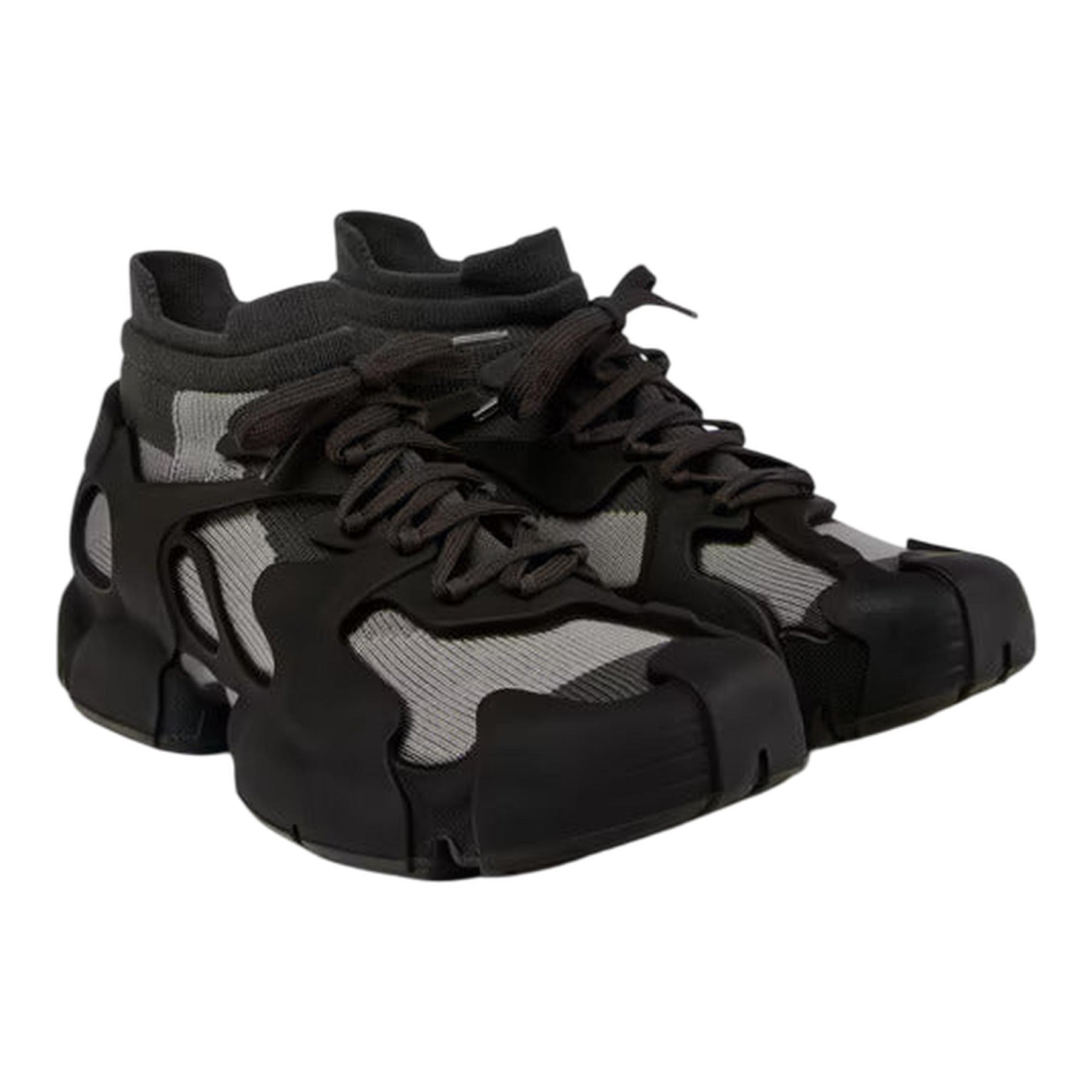 Giày sneaker màu xám với thiết kế lồng, bên trong là tất 3D dệt từ PET tái chế chống thấm nước, bên ngoài làm từ TPU tiêm trực tiếp, và đế ngoài từ PU tái chế. Hoàn toàn có thể tái chế.