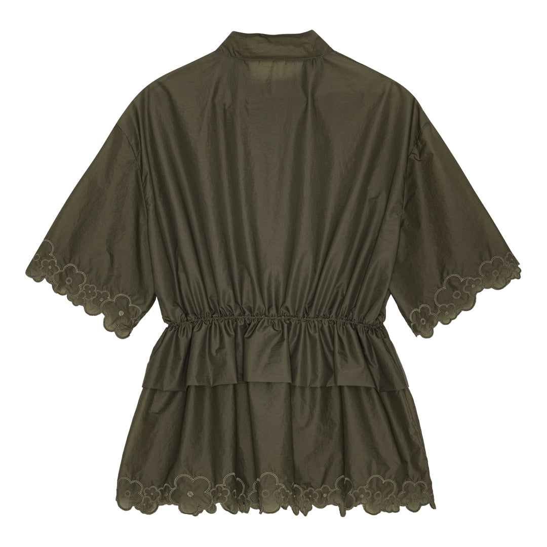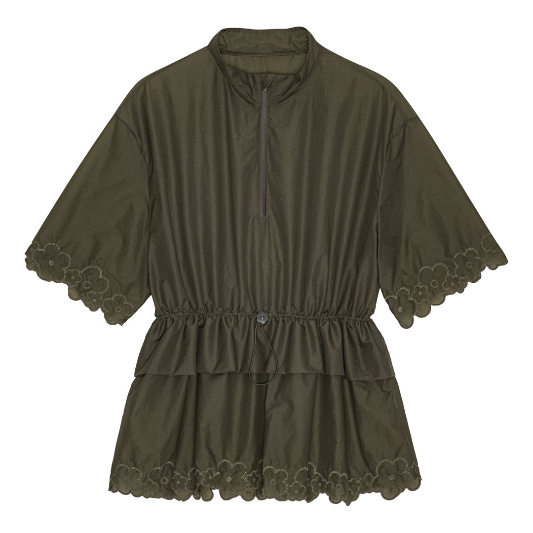 Chiếc áo Avi vừa thể thao vừa lãng mạn. Được cắt từ chất liệu ripstop, thiết kế thoải mái với cổ đứng và khóa kéo một phần, cùng với vai hơi rớt xuống trên tay áo t-shirt. Một món đồ sẵn sàng được tái tạo với sự điều chỉnh của dây rút có chi tiết hoa, có thể điều chỉnh ở phần eo. Họa tiết hoa thêu ở viền áo và cổ tay, cùng với những chi tiết này làm cho món đồ này trở nên không thể nhầm lẫn với Cecilie Bahnsen.